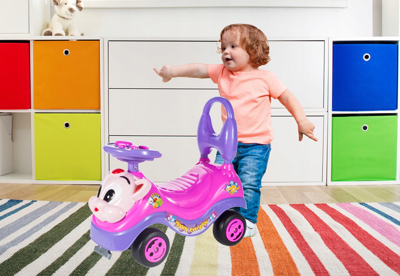 Эта необычная игрушка не только подходит для катания, но и благодаря высокой спинке поможет нашему ребенку сделать первые шаги в ходьбе.