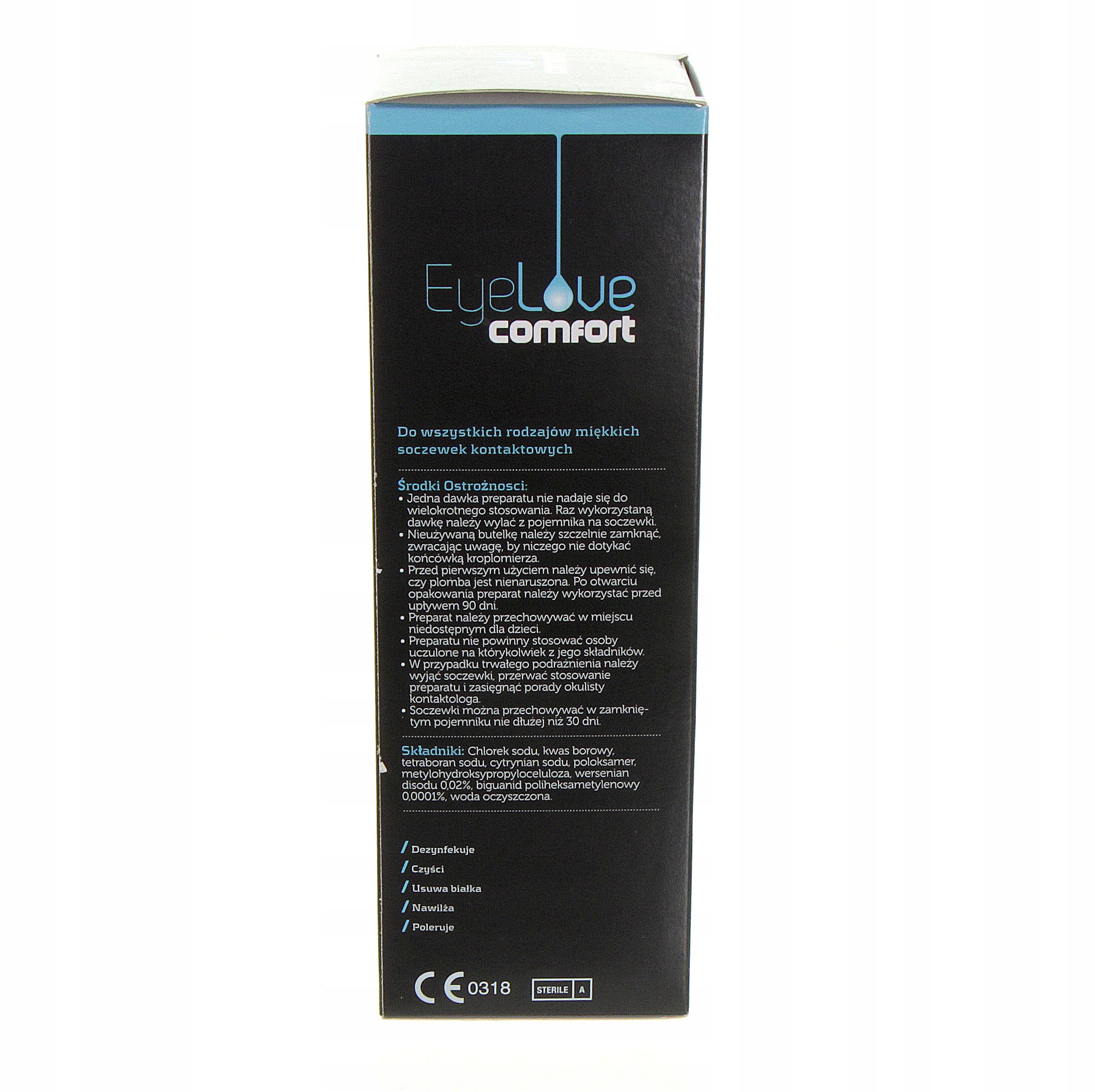 Клинические исследования показали, что срок ношения контактных линз с EyeLove Comfort на 2 часа дольше, чем с другими многофункциональными растворами, используемыми пациентами (обычно 10 часов, тогда как с EyeLove Comfort линзы можно носить в течение 12 часов). Это возможно благодаря большему комфорту ношения линз за счет более высокой степени гидратации. Высокая степень увлажнения, получаемая благодаря этой формуле, предотвращает неприятное ощущение сухости глаз.