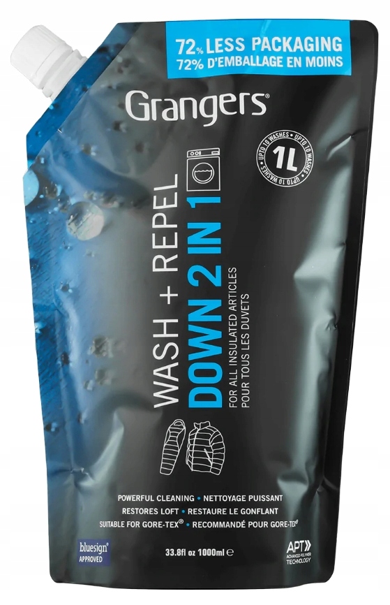 Многие хозяйственные мыла и моющие средства содержат химические вещества, которые может удалить заводское покрытие DWR (поверхностную пропитку) с тканей и повредить пух. Продукция Granger's имеет специальную формулу, которая одновременно стирает и пропитывает пух за один цикл стирки. Стирка и пропитка одновременно экономят время, энергию и воду.