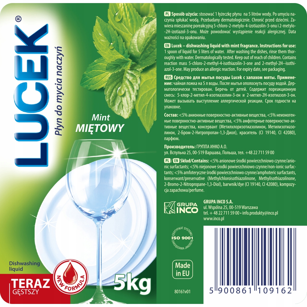 Жидкость для мытья посуды Lucek имеет специально подобранные поверхностно-активные вещества и чистящие свойства. Не оставляет разводов на вымытой посуде, а дополнительно придает ей блеск. Жидкость имеет очень хорошую консистенцию и хорошо пенится. Это эффективно и безопасно для окружающей среды.
