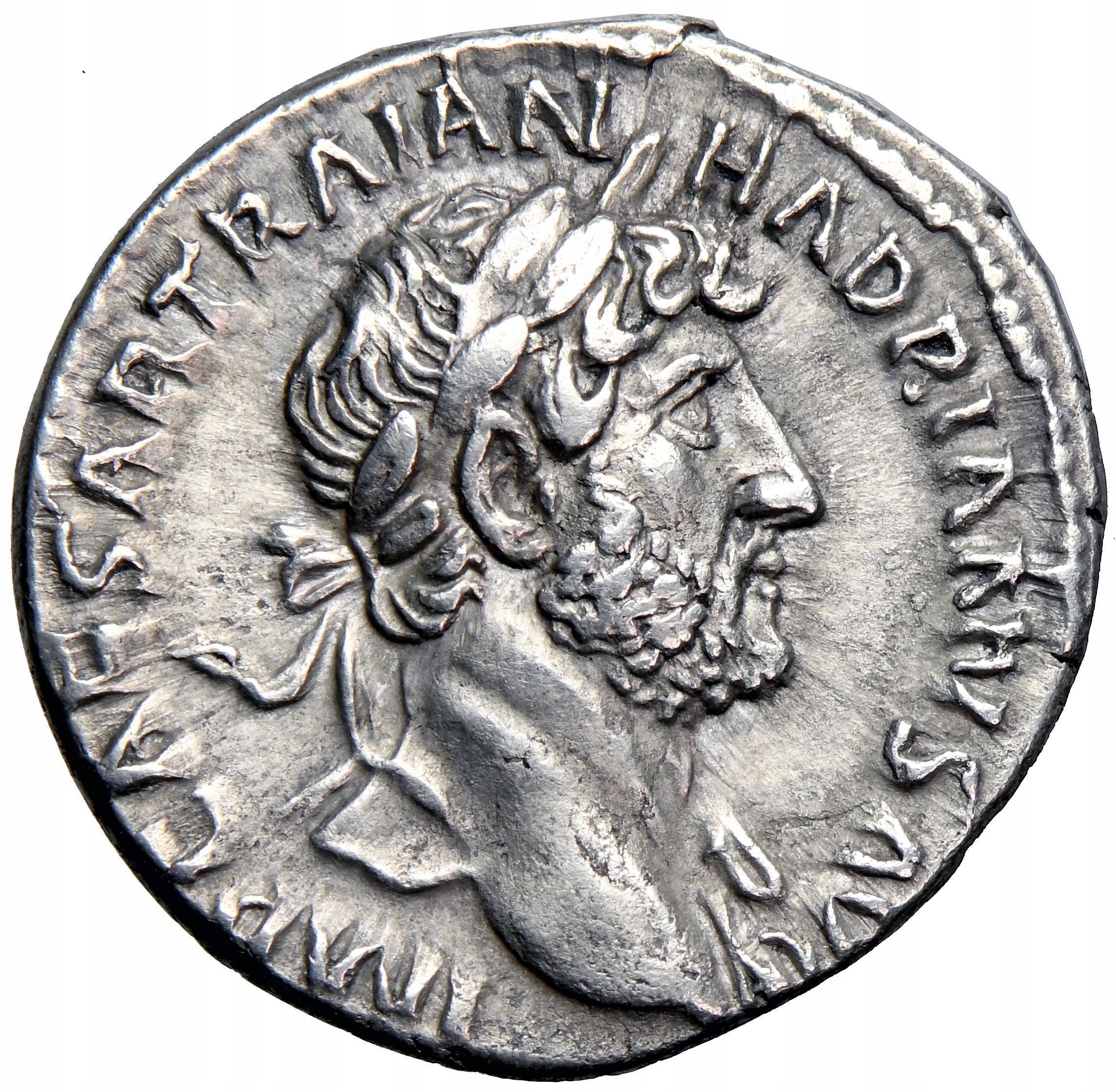 Ав. ИМП ЦЕЗАРЬ ТРАЯН АДРИАНВС АВГ, бюст императора в лавровом венке вправо.