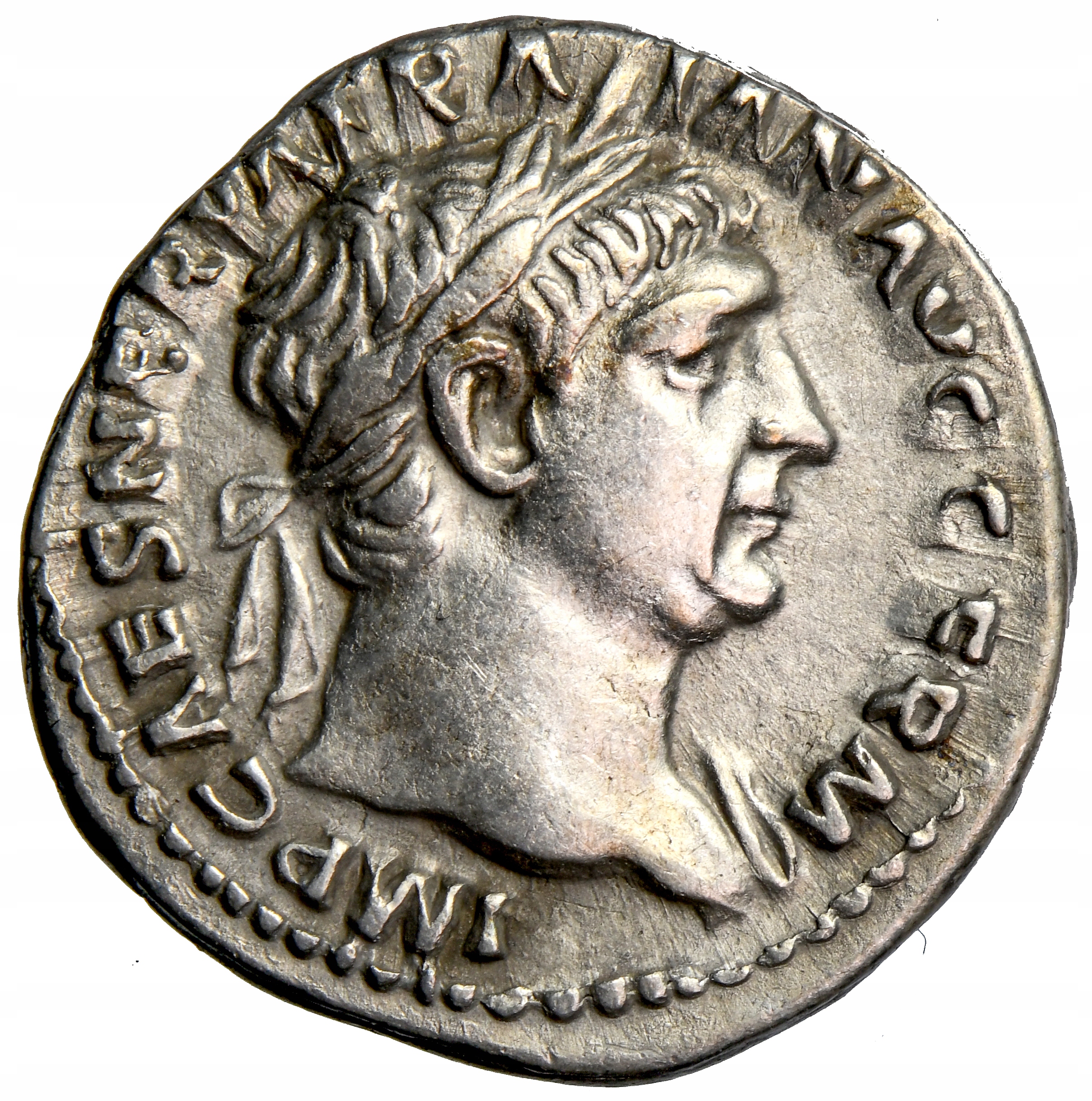 Ав. IMP CAES NERVA TRAIAN AVG GERM, голова императора в лавровом венке справа.