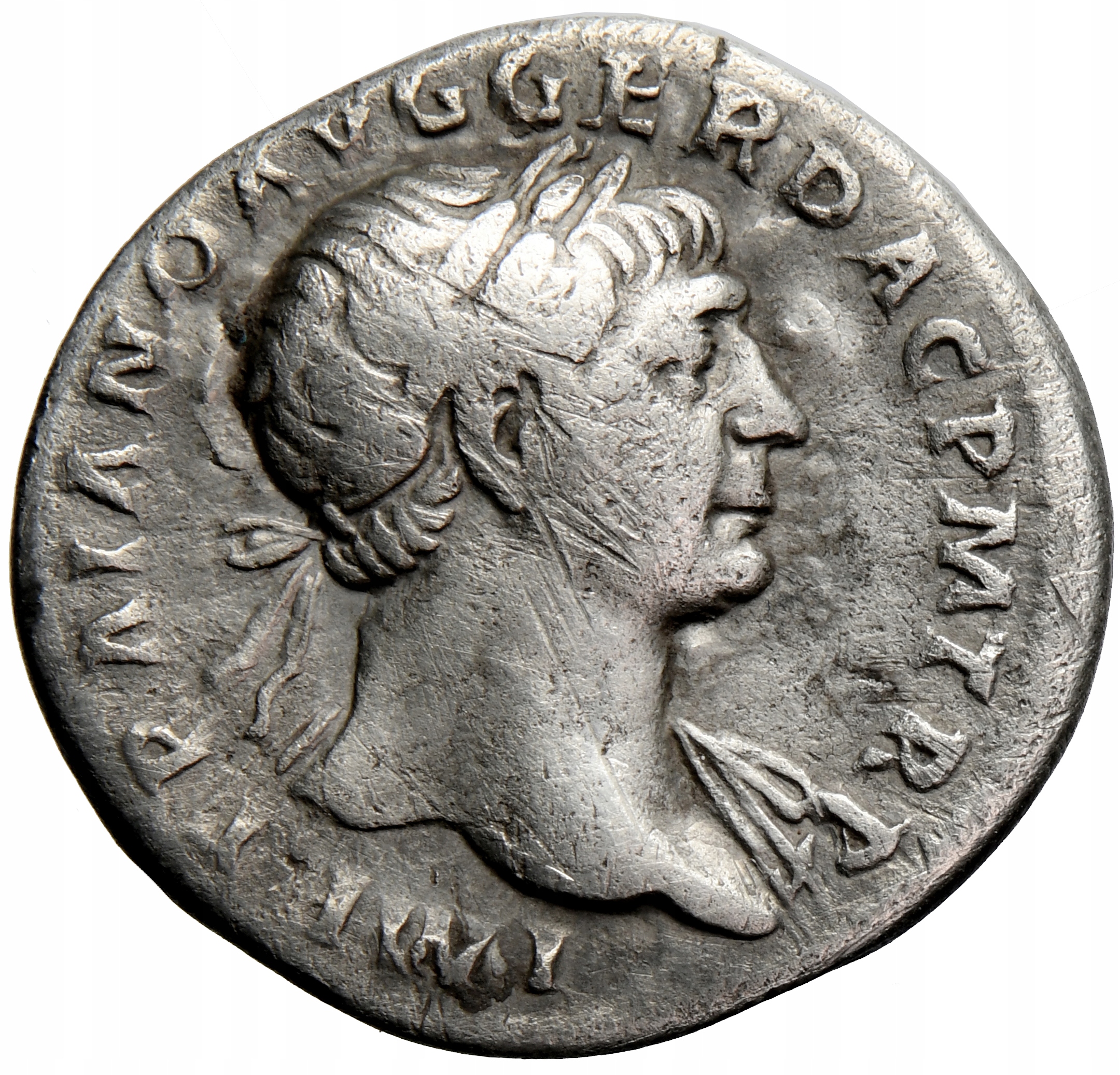 Ав. IMP TRAIANO AVG GER DAC PM TR P, бюст императора в лавровом венке вправо.