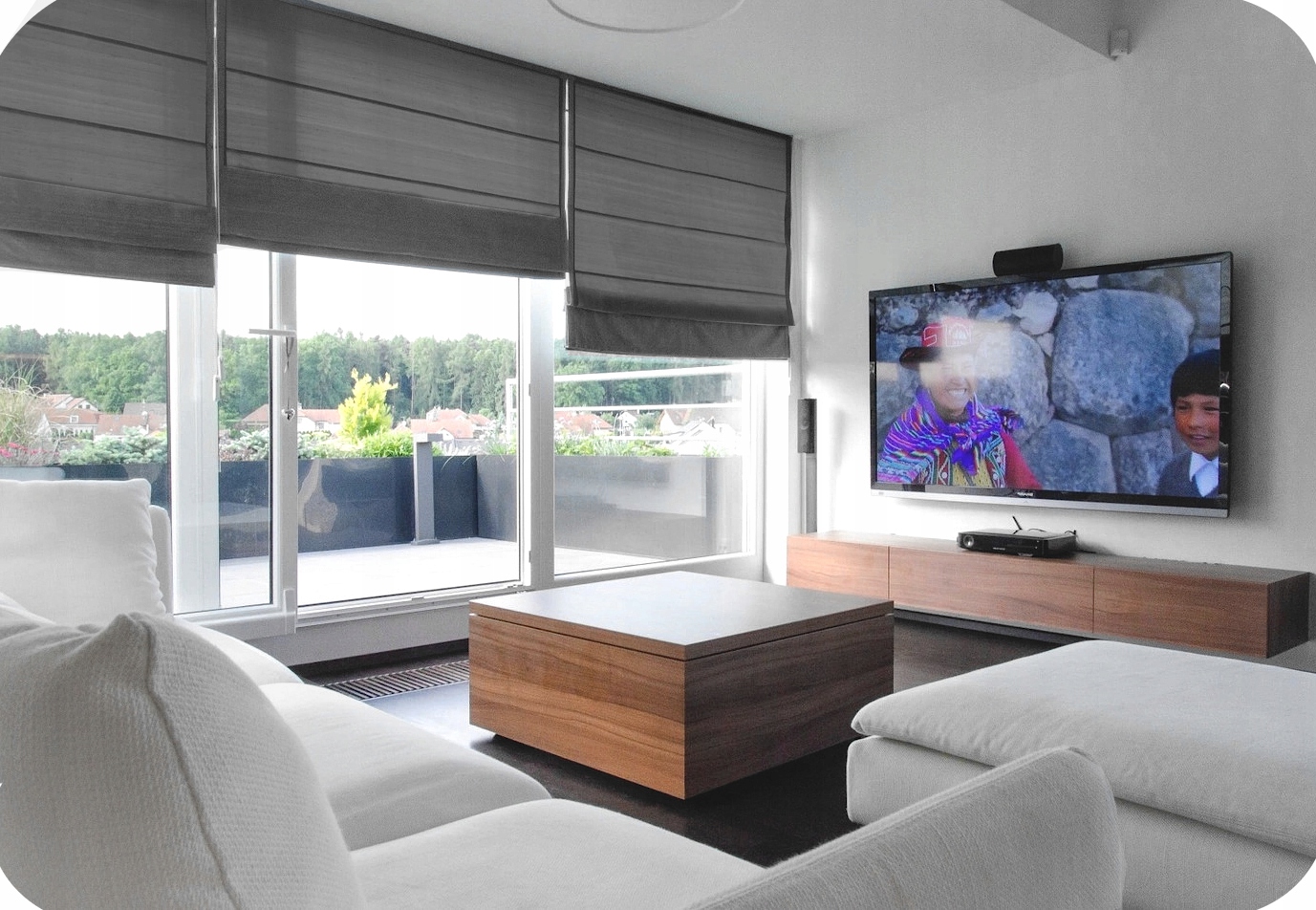 Римская штора с цепочной системой, изготовленная на заказ из туннельной ткани Аляски.