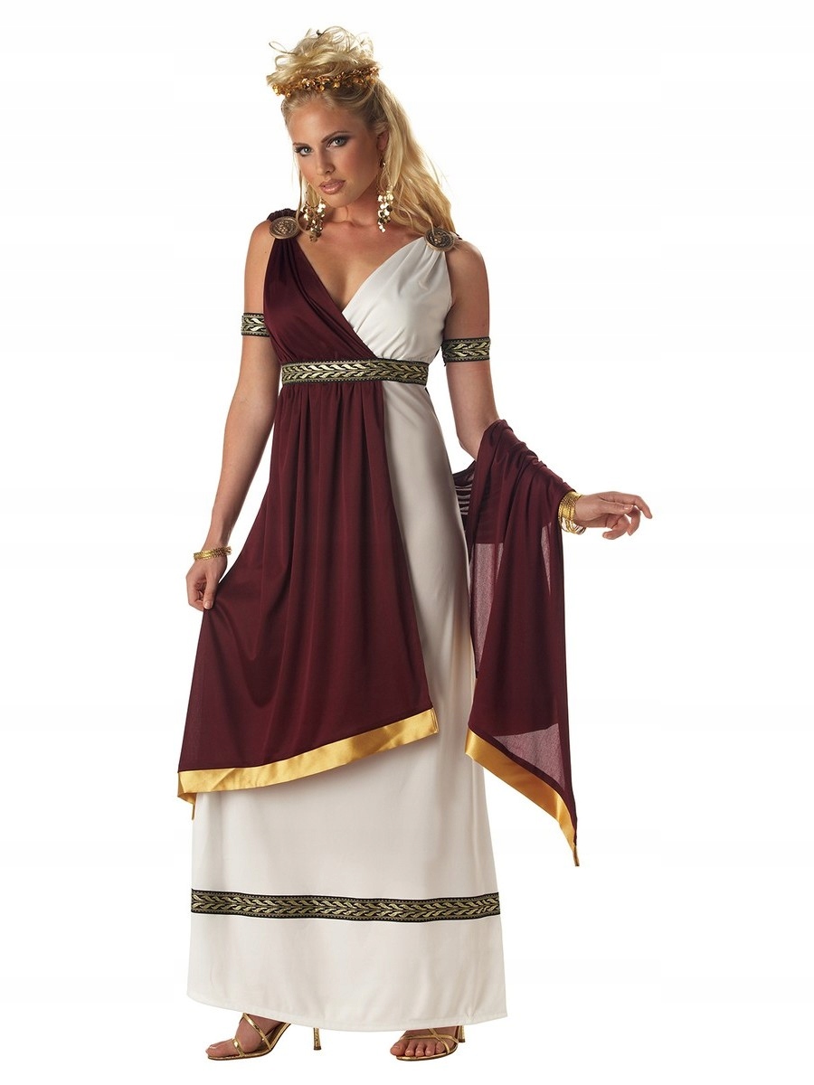 В этом костюме вы олицетворяете величие и славу Римской империи. Идеально подходит для вечеринки в античном стиле. Цветовое сочетание и крой платья были созданы в стиле Древнего Рима. Красивую линию горловины дополнительно подчеркивает бейка, узор которой встречается и на браслетах.