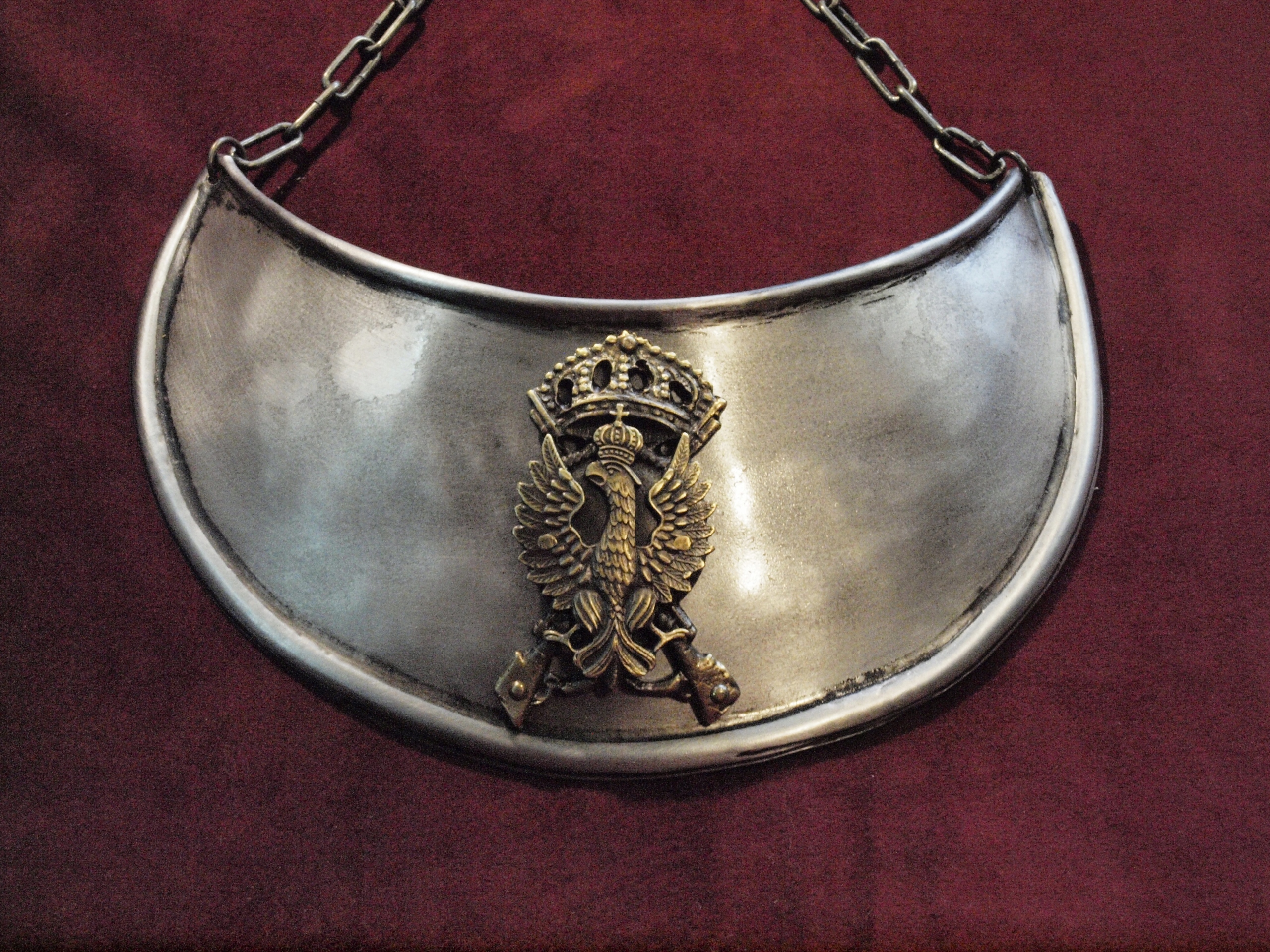 Стальной горжет в офицерском стиле Варшавского герцогства. Репуссе, солдатский. В центре - польский орел начала XIX века (выполнен с оригинала методом выплавки. Орел опирается на скрещенные нарезы, увенчанные короной.
