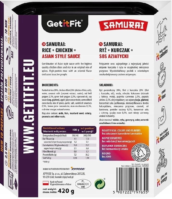 Просматривая «Рис з куркою та азіатським соусом Get It Fit», вы можете быть уверены, что данный товар из каталога «Мясные блюда» будет доставлен из Польши и проверен на целостность. В цене товара, указанной на сайте, учтена доставка из Польши. Внимание!!! Товары для Евросоюза, согласно законодательству стран Евросоюза, могут отличаться упаковкой или наполнением.