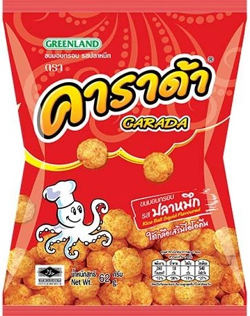 Гренландская карада — хрустящие рисовые шарики, вдохновленные азиатскими вкусами. Интенсивный вкус кальмара в сочетании со специями и хрустящая текстура делают его идеальной закуской для любителей восточных вкусов. Изделие имеет привлекательный красный цвет благодаря использованию красителей и специй. Они идеальны в качестве быстрого перекуса, на вечеринке, в кино или в поездке. Рекомендуется любителям тайской кухни и морских ароматов.