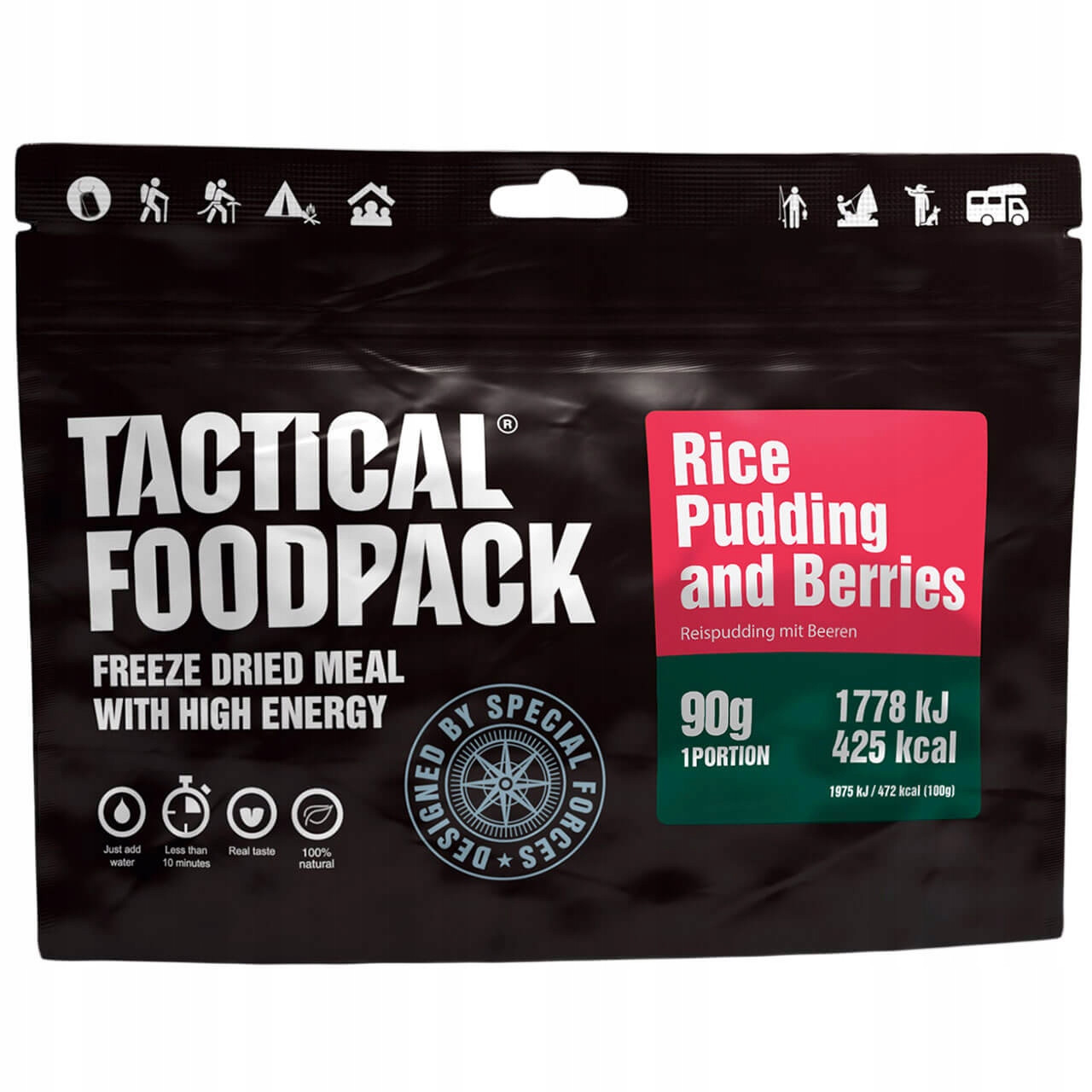 Райсный пудинг - еда, употребляемое почти в каждом углу мира - это отличный завтрак в начальном удержании. Это особенно посвящено всем вегетарианцам и сладким любовникам. В версии тактического пищевого пакета Gluten -малину использовалась малина в качестве дополнения, которая содержала ценные витамины и минералы. Кстати, они придают еде сладкий и здоровый характер, а также чрезвычайно эстетический вид. Продукт на 100% натуральный - он не содержит консервантов или искусственных добавок. Из-за беспроблемного перевода и подготовки он идеально подходит для кемпинга, блуждания и других мероприятий, предпринимаемых на открытом воздухе.