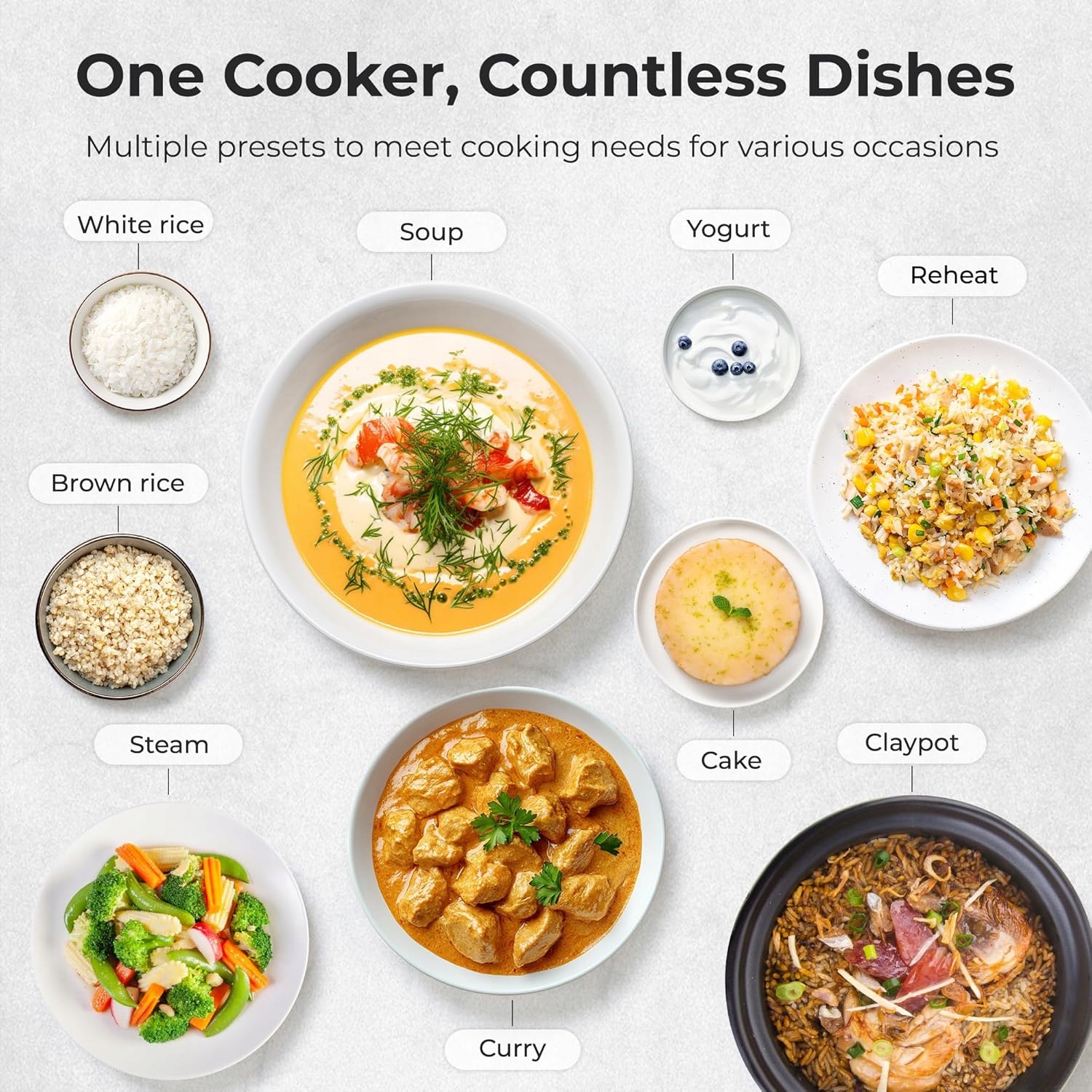 - szech -связанные функции - Мини -пароход Tokit предлагает 9 практических программ: рис, карри, приготовленная на пару, суп, йогурт, леса, нагревание и многие другие. Легко подготовить различные блюда без необходимости использовать дополнительное оборудование.
