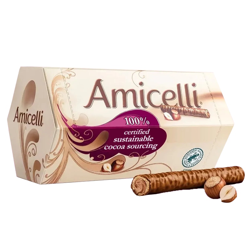 <р> Идеальные пралине в качестве уникального подарка для развлечения ваших друзей. а также для сладкого перерыва в течение дня. Подарите себе настоящее удовольствие. <р> Нежный, легкий и такой чудесно ореховый – создан специально для делюсь с близкими. Амичелли также является отличным дополнением к домашним. десерты и пирожные. Удивите своих гостей нежным вкусом Амицеллы.Трубка вафля (24%), с начинкой (45%), с арахисовым кремом, залитая молоком шоколад (30%).