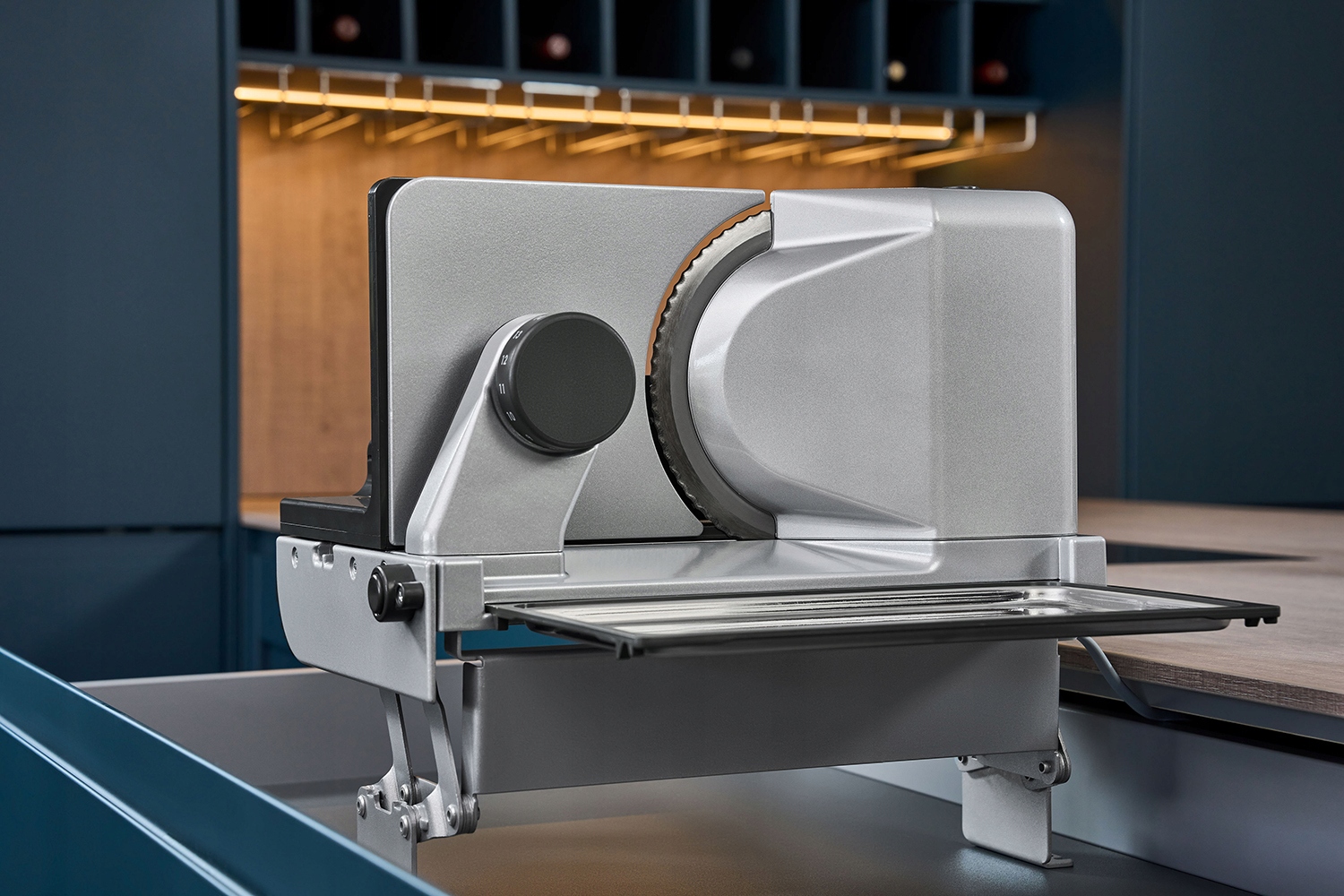 Slicers, встроенные в кухонные ящики, занимают мало места, и в то же время они всегда под рукой. Встроенное решение также сохраняет пространство на столешнице.