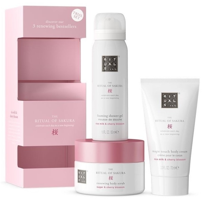 Ритуал набора Sakura - это идеальное введение в мир ритуалов и идеальный подарок для любимого человека или для себя. Он состоит из трех продуктов бестселлера из этой коллекции: гелевой душевой пены, крем для тела, содержащего 92% ингредиентов натурального происхождения и скраба для тела сахара, содержащего 91% ингредиентов натурального происхождения.