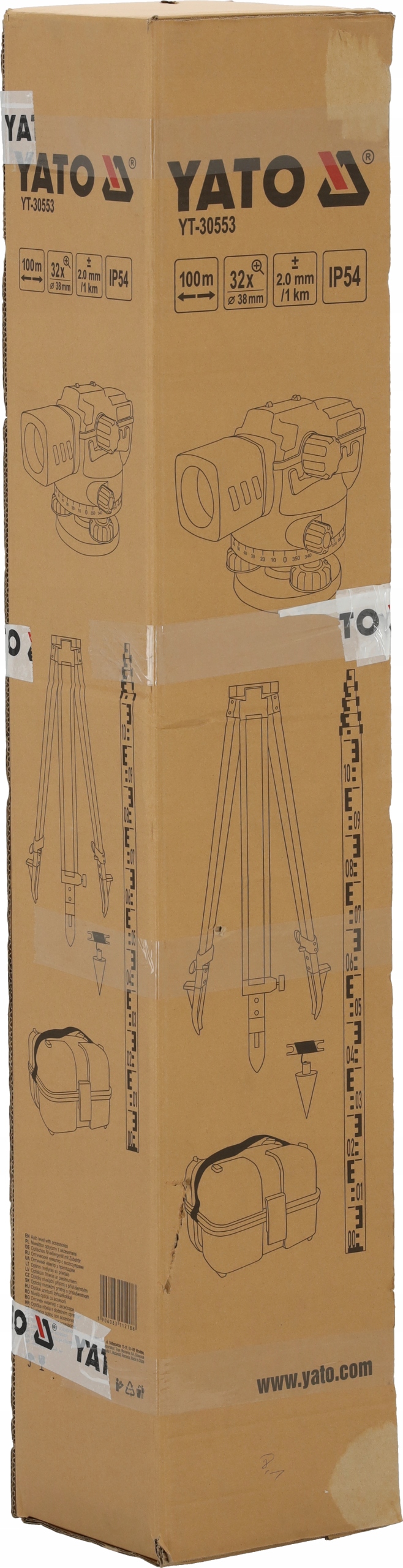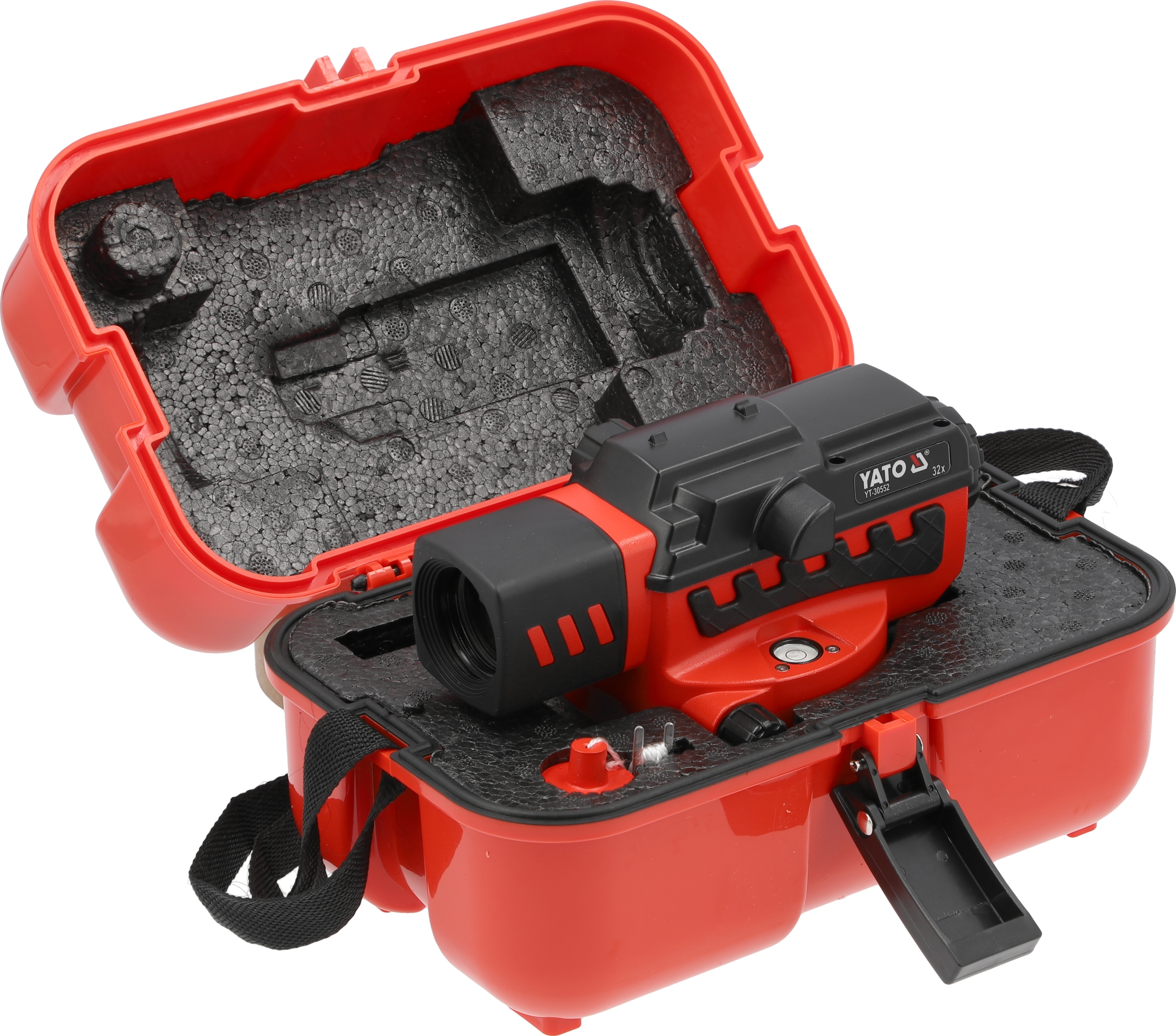 Профессиональный оптический уровень yato в наборе с штативом и 5-метровым геодезическим пятном. Инструмент, предназначенный для точных измерений высоты в строительстве, геодезии и других полевых работах.