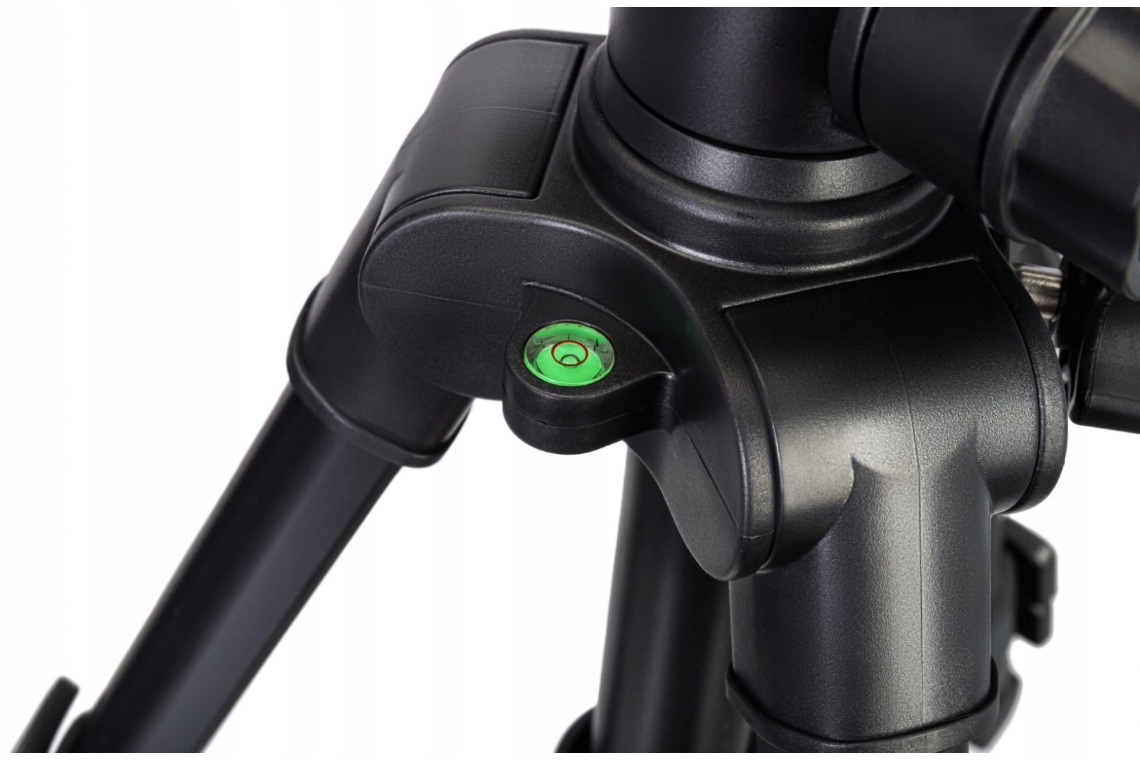 Высота штатива легко регулируется с помощью выдвижных ножек или центральной стойки, которые блокируется защелками. Устойчивость штатива повышается за счет резинового покрытия ножек. Дополнительную стабилизацию обеспечивает крюк центральной стойки, что позволяет увеличить вес штатива. Пузырьковый уровень облегчает идеальное позиционирование штатива.