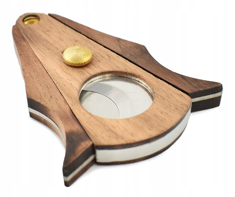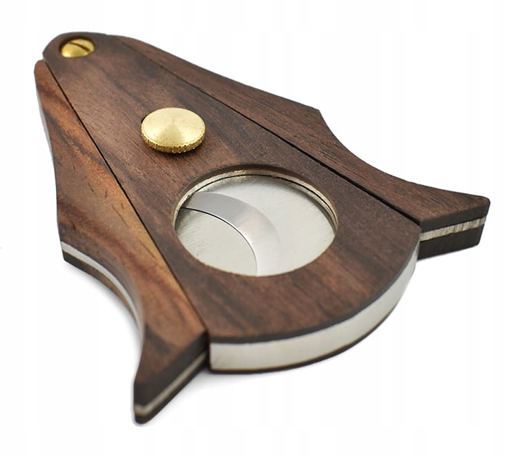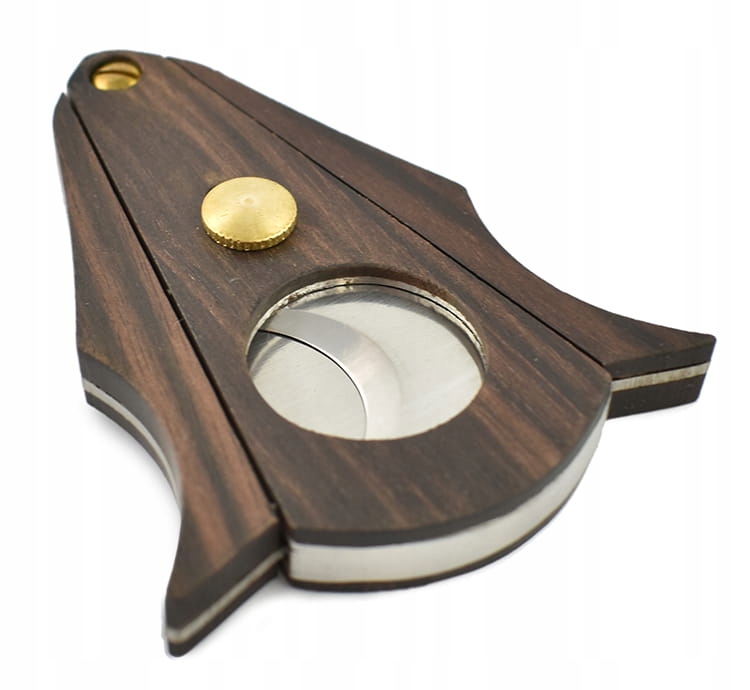 Нож для сигар очень характерного дизайна с интересными деревянными и золотыми элементами. Товар упакован в фольгированную упаковку.