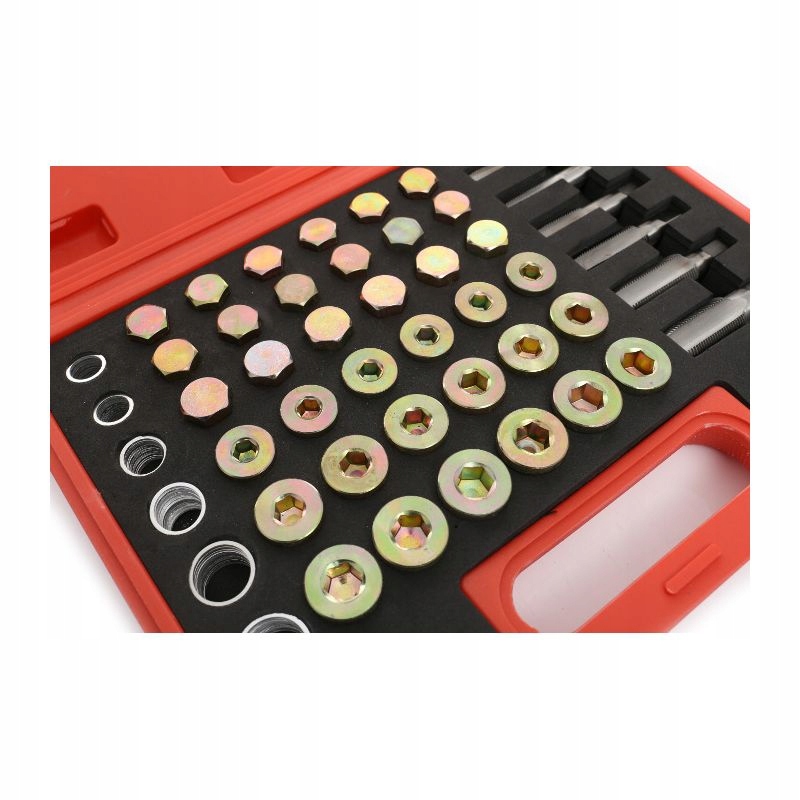 Этот набор, состоящий из 114 элементов, включая различные краны и пробки, позволяет быстро и эффективно отремонтировать резьбу сливных пробок. для масляного поддона, коробки передач и других компонентов, соответствует большинству резьб, используемых в легковых автомобилях и легких грузовиках.