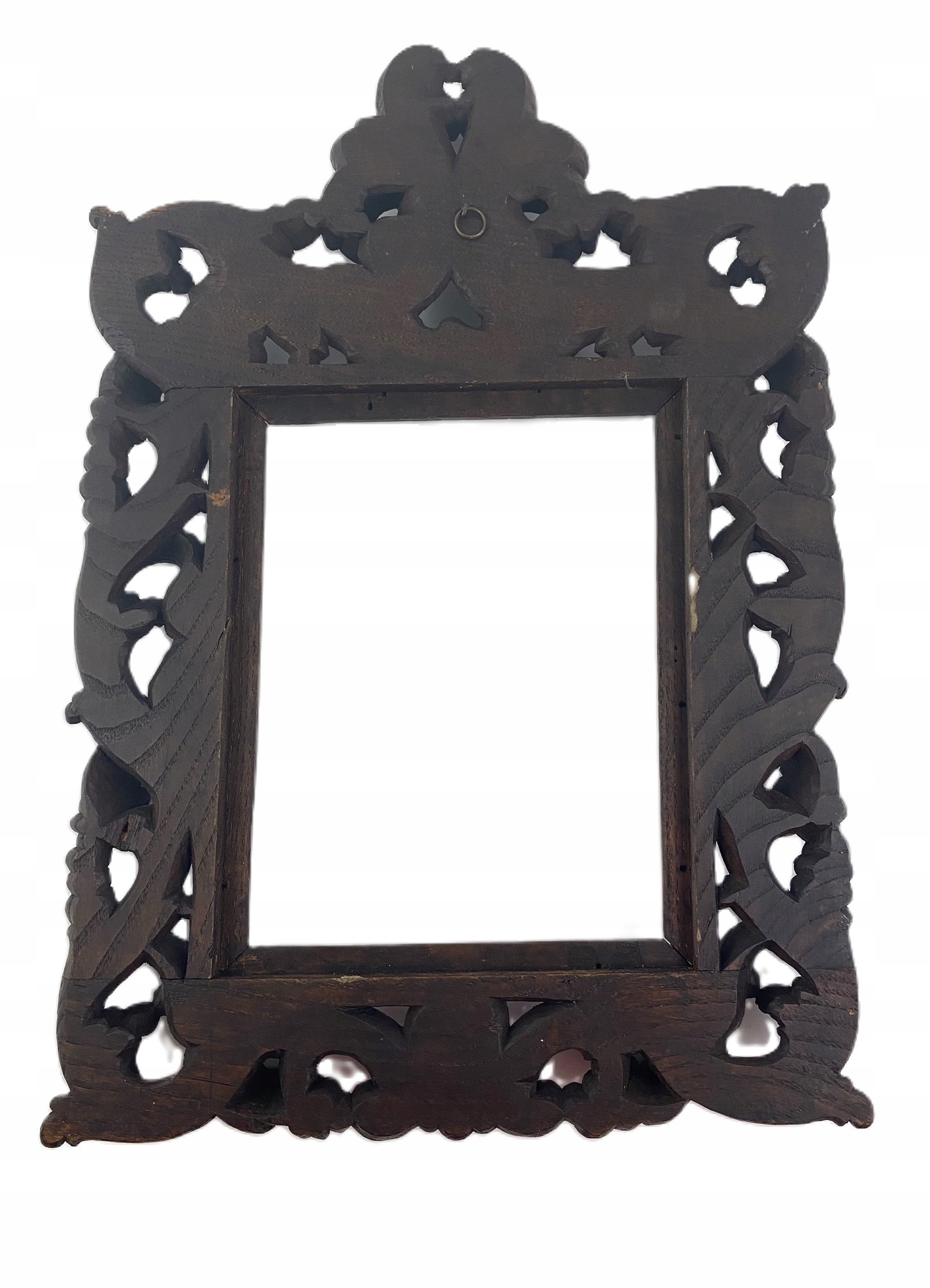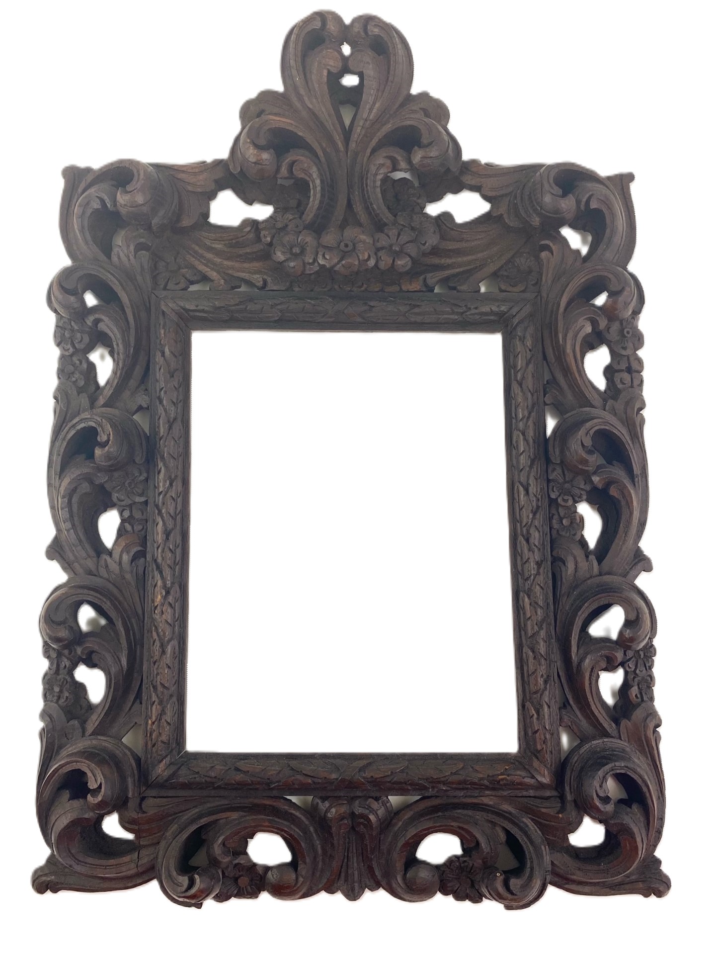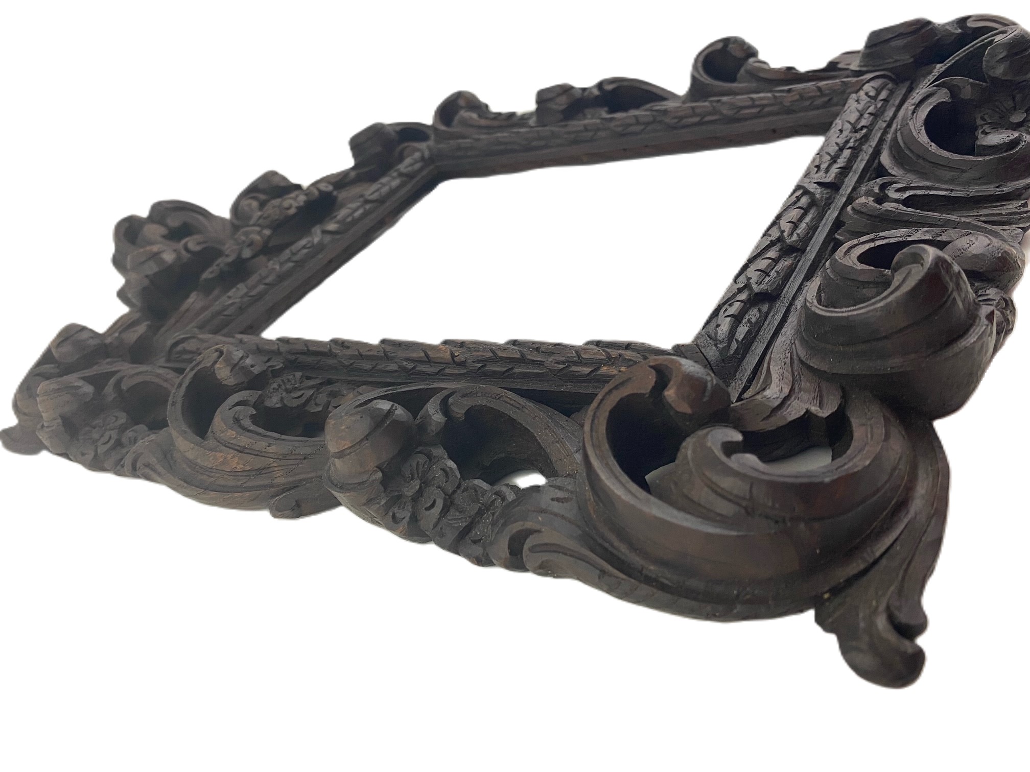 Прекрасная резная рама 19 века, по стилю напоминающая лиственные итальянские рамы 17 века, с ажурным декором из симметрично расположенных листьев и цветов аканта, а также лавровым венком возле светильника рамы, полностью вручную, очень точно вырезаны из каштана. Окрашена в темный цвет морилкой и пропитана маслом. Рама естественным образом сохранилась без каких-либо повреждений. Состояние очень хорошее, скорее всего предназначалась для обрамления фотографии или зеркала. Теперь он также будет отлично работать в этих приложениях. В комплект входит небольшой кулон (круг).