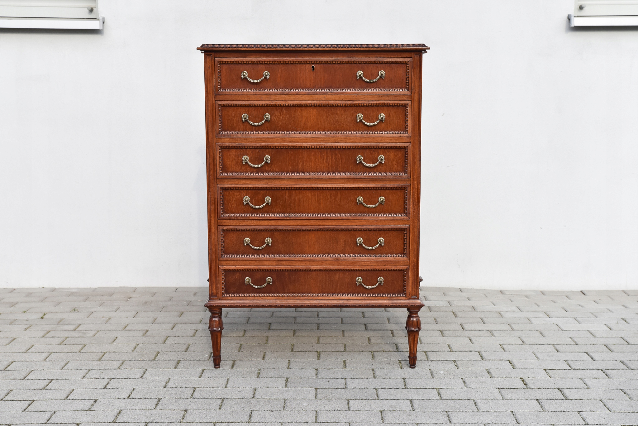 РІЗЬБЛЕНА ВИСОКА ТА ВУЗЬКА СКРИНЯ З ГОРІХОВОГО ГОРІХУ, БАГАТО ДЕКОРАЦІЯ, 6 ЯЩИКІВ