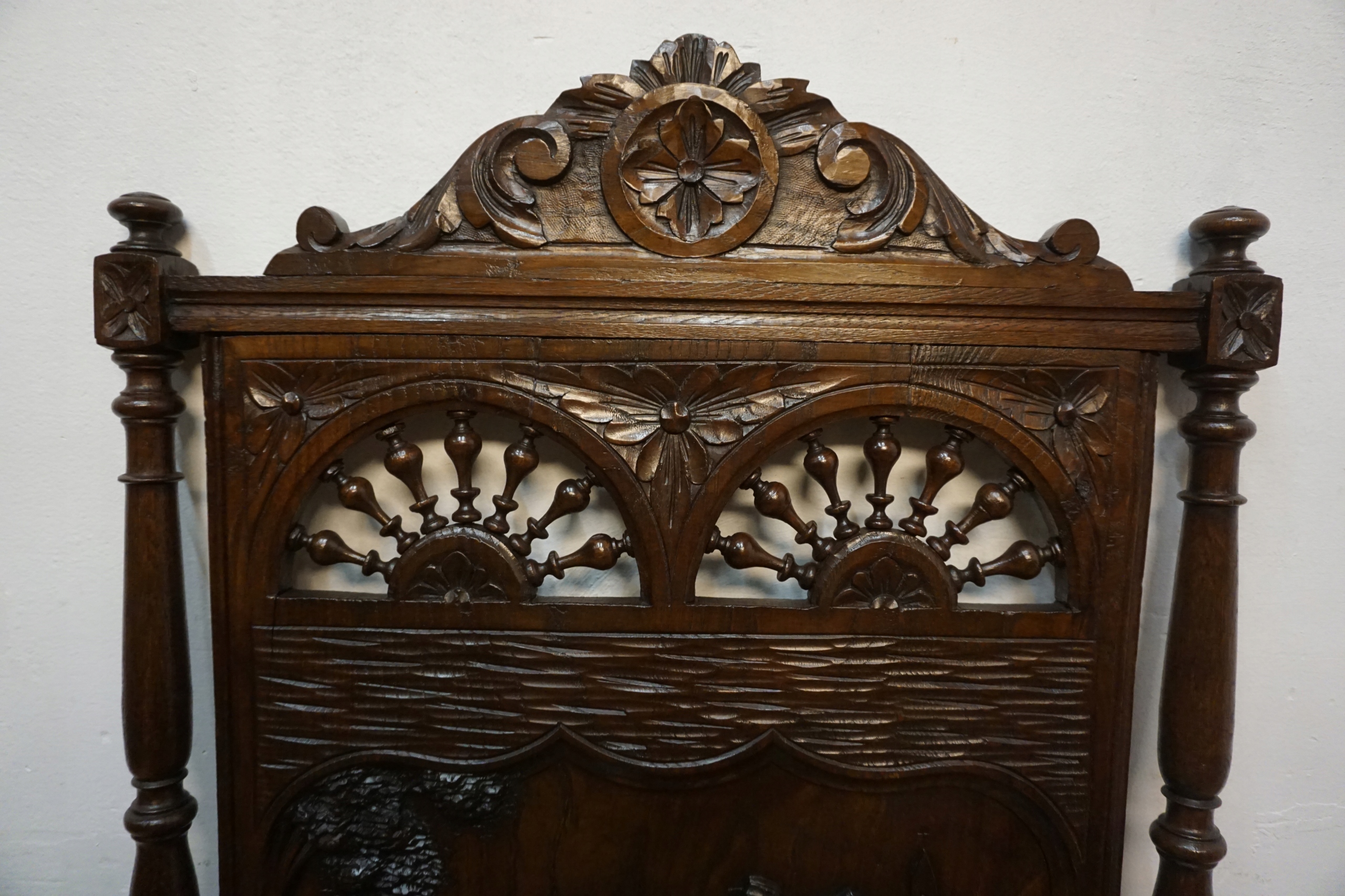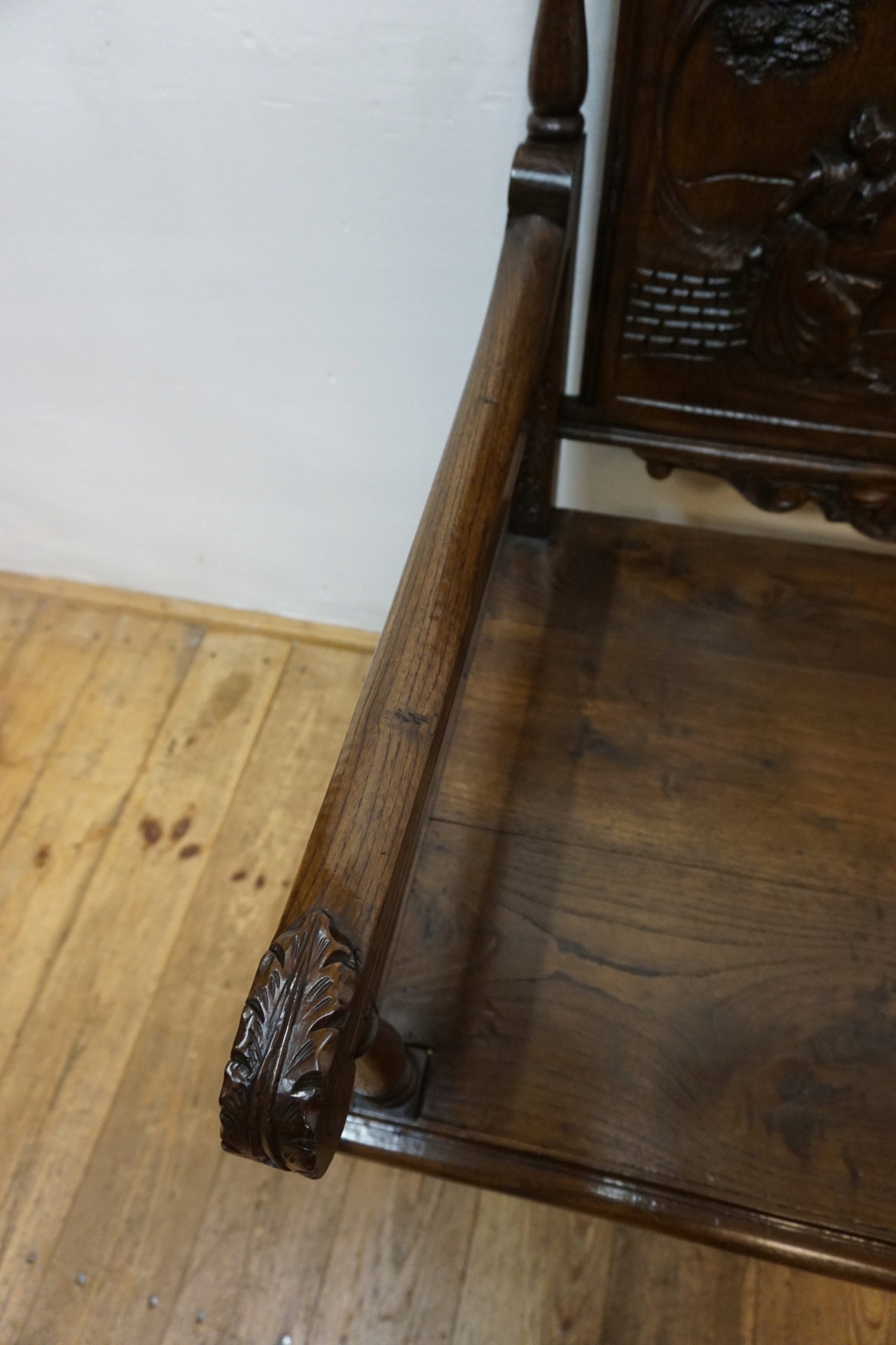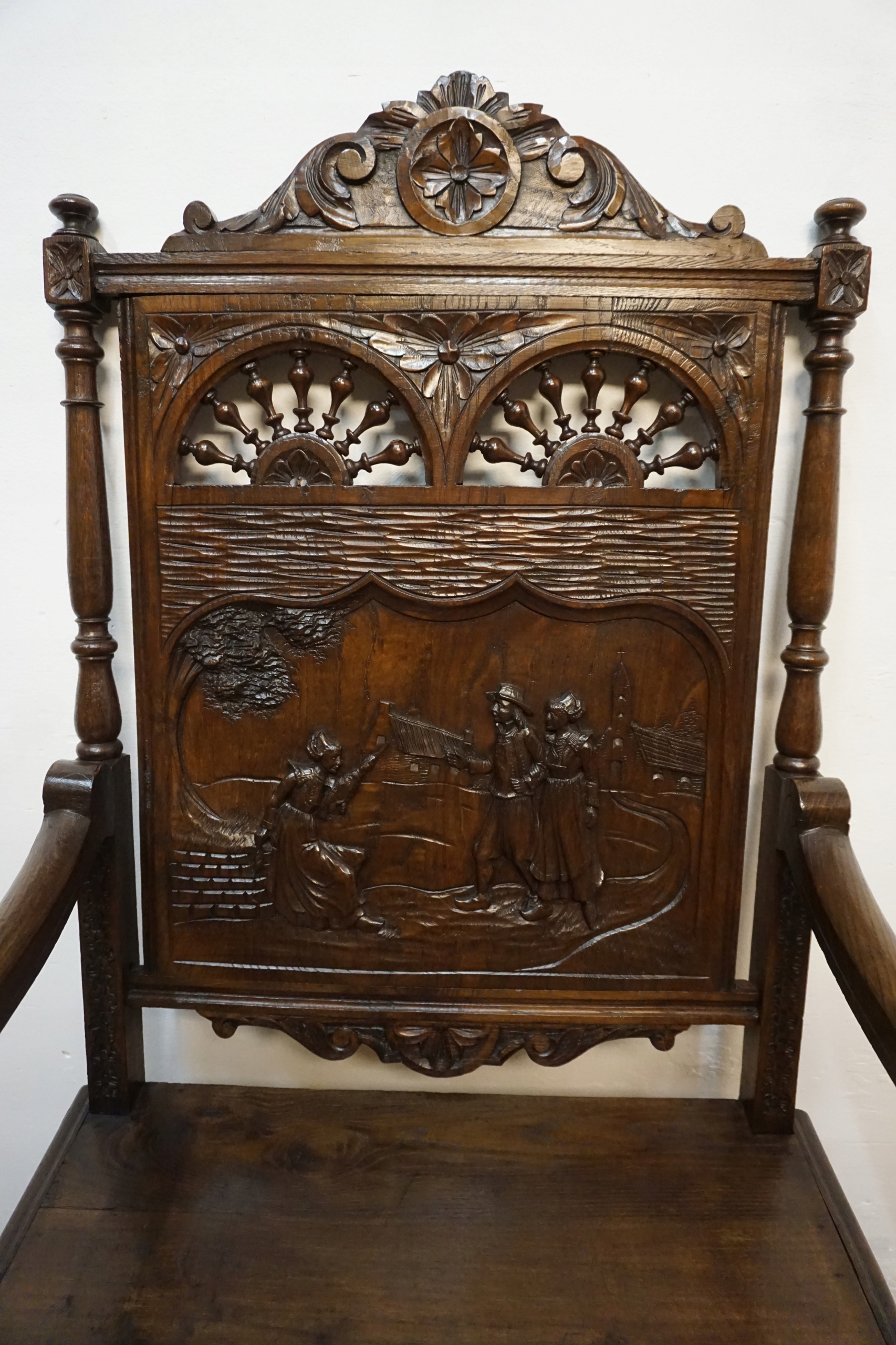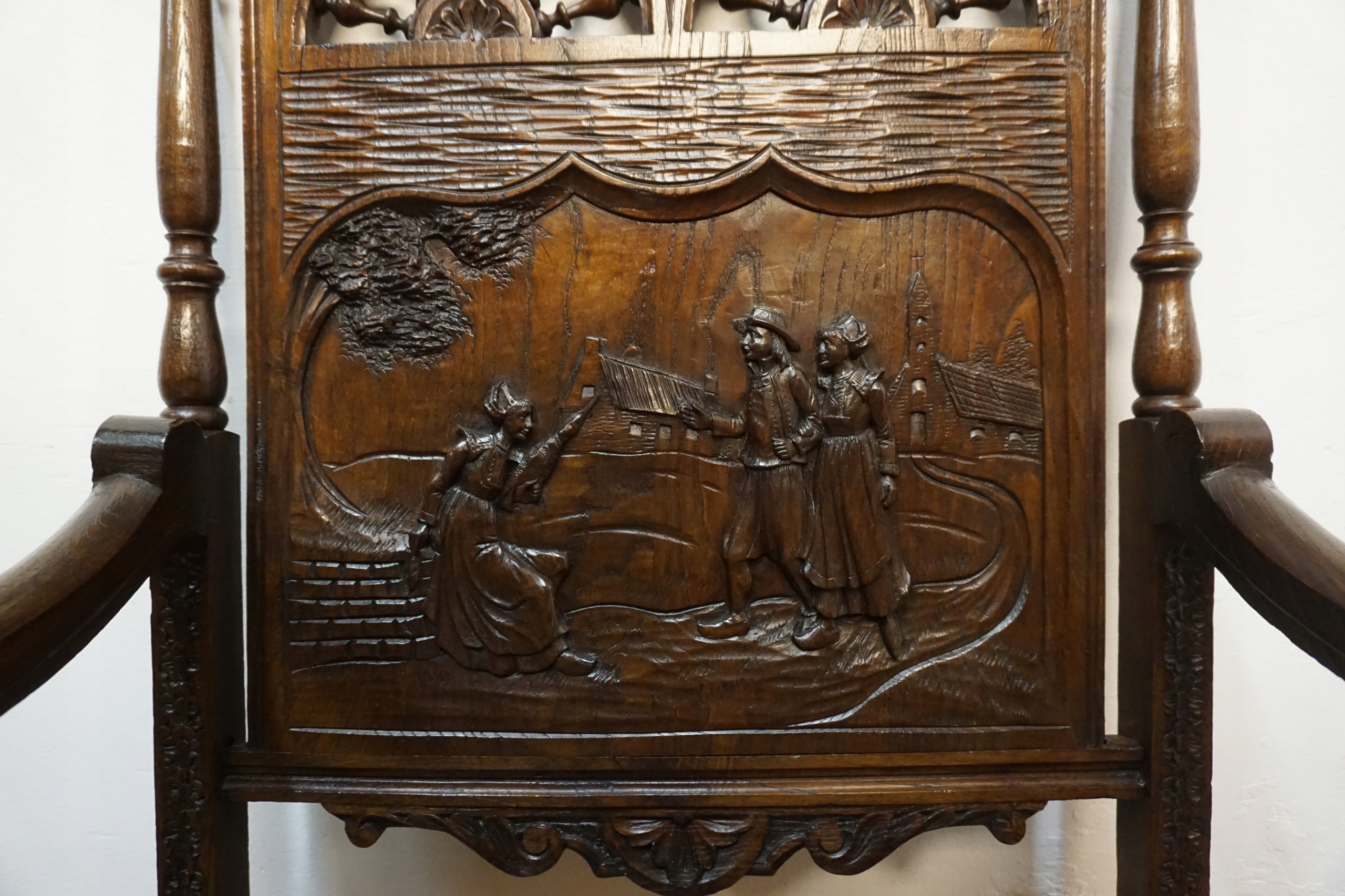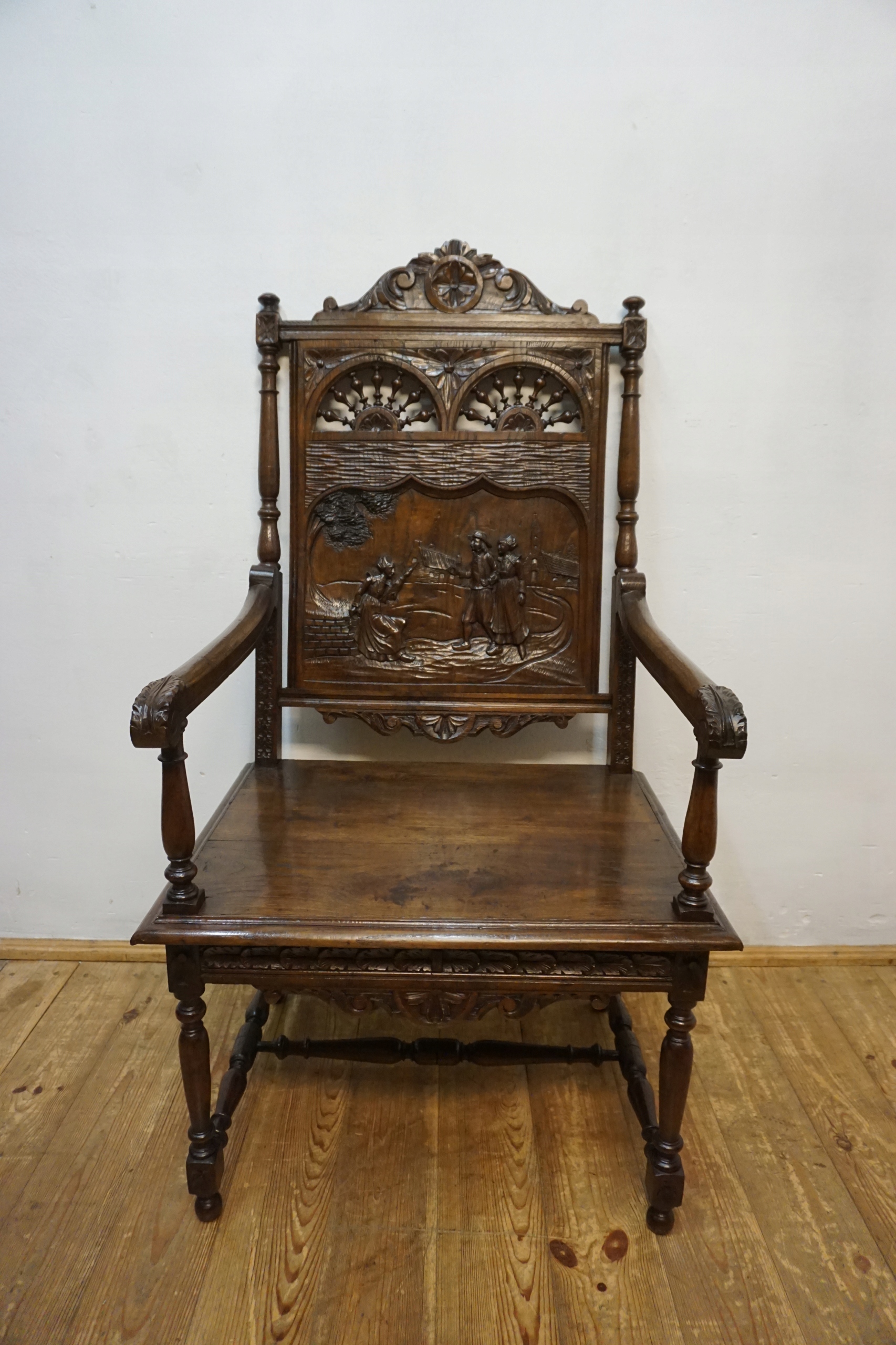 Уникальное бретонское кресло конца XIX века, образец традиционного французского мастерства из региона Бретань. Изготовленное из массива дуба, богато украшенное резьбой на народную тематику, оно представляет собой настоящее произведение прикладного искусства и образец резьбового мастерства той эпохи.