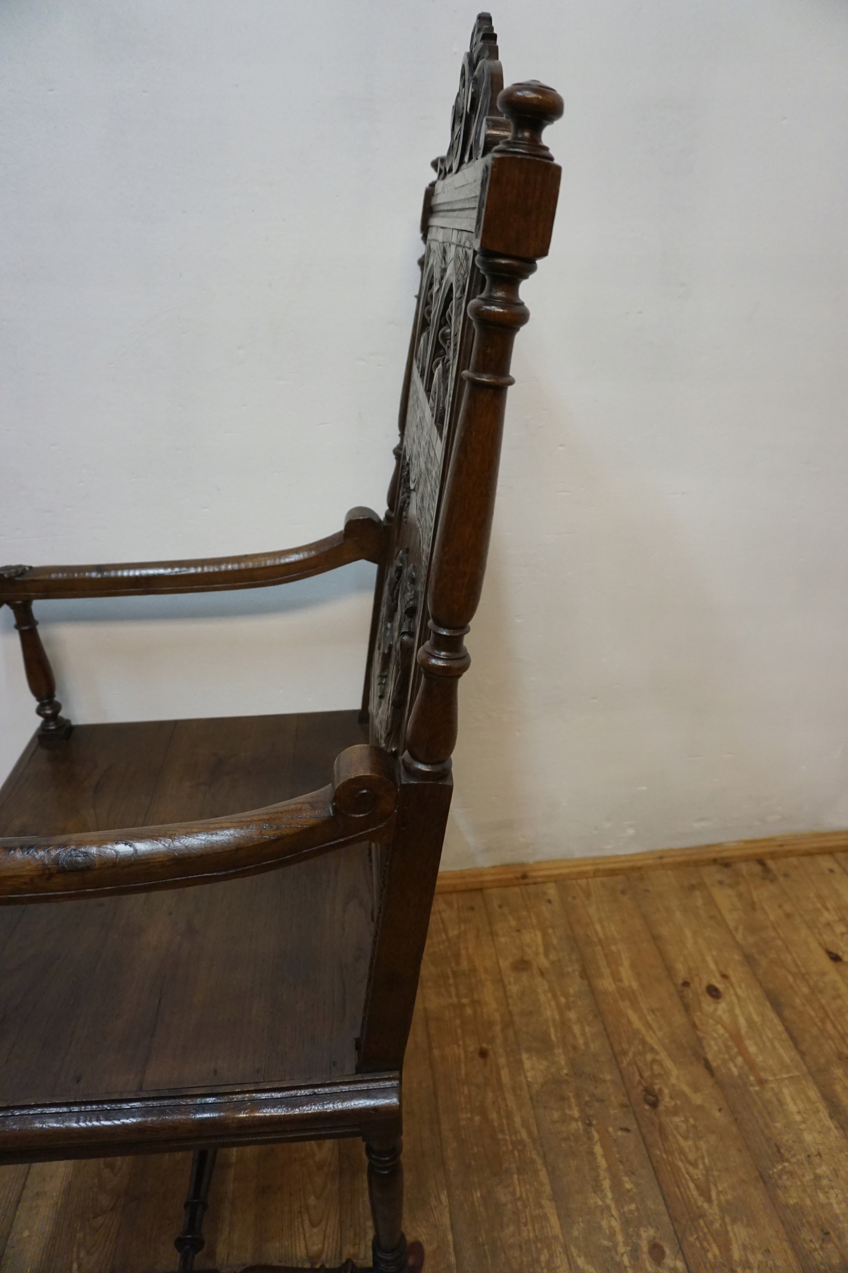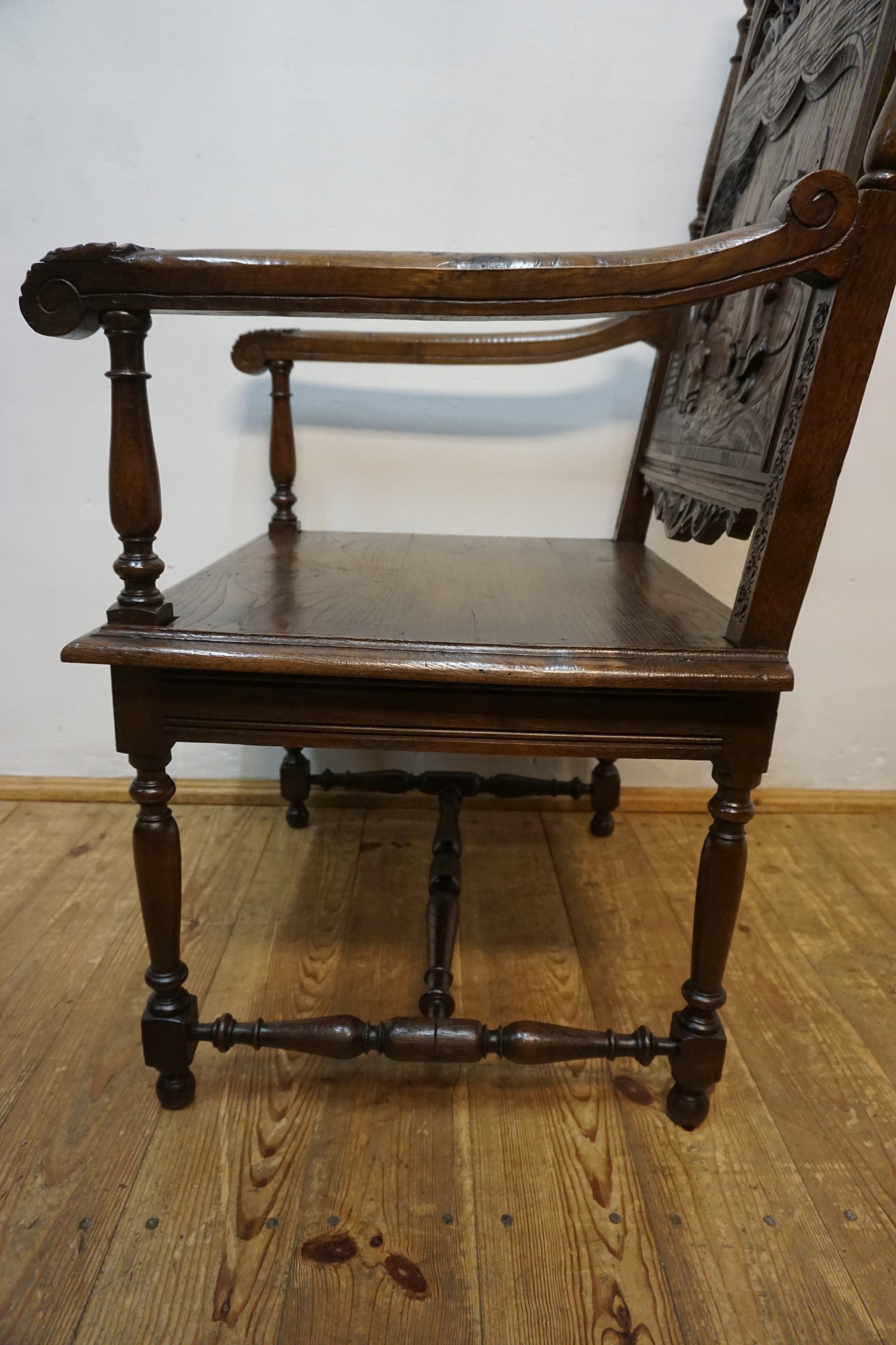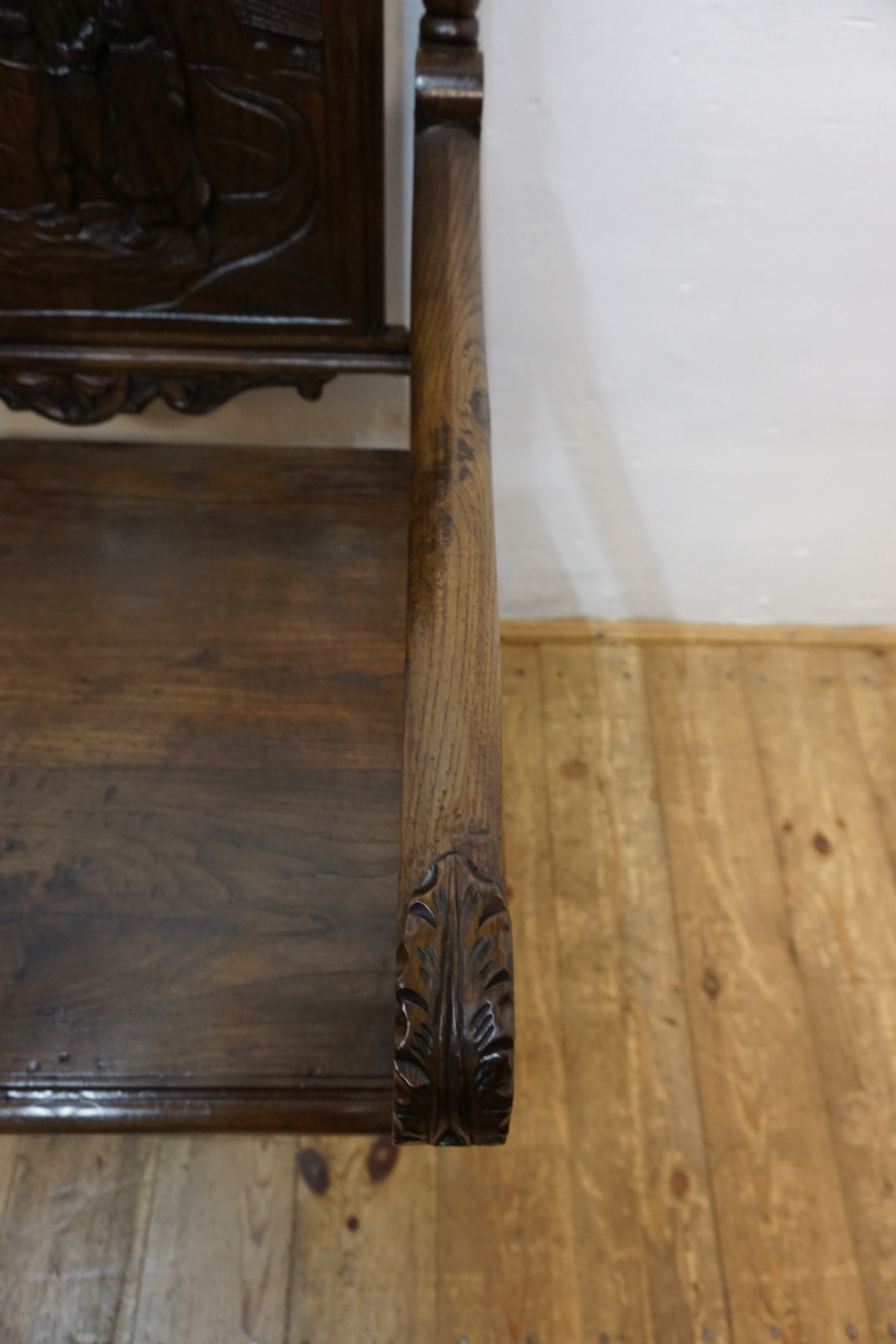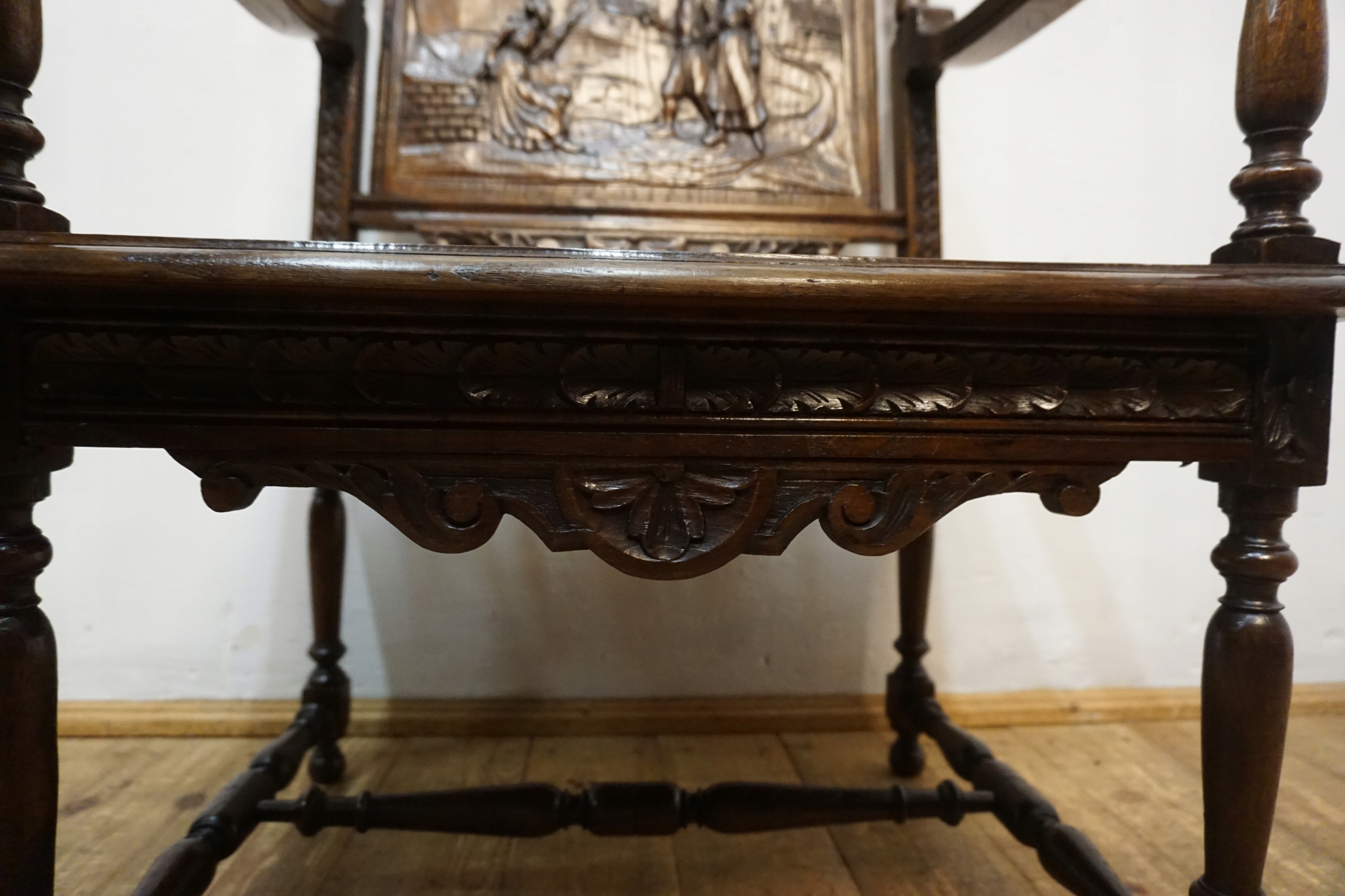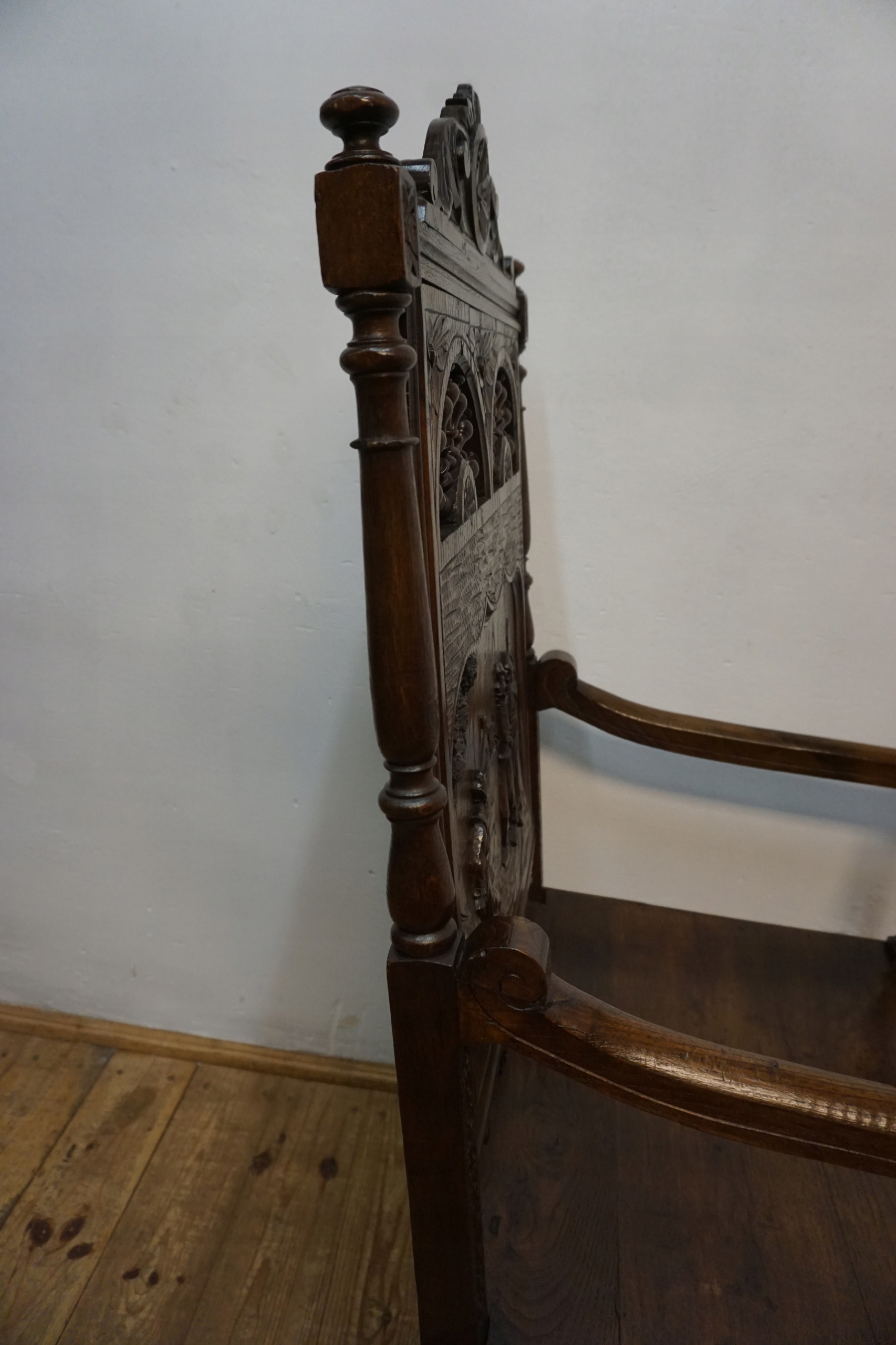 Уникальное бретонское кресло конца XIX века, образец традиционного французского мастерства из региона Бретань. Изготовленное из массива дуба, богато украшенное резьбой на народную тематику, оно представляет собой настоящее произведение прикладного искусства и образец резьбового мастерства той эпохи.