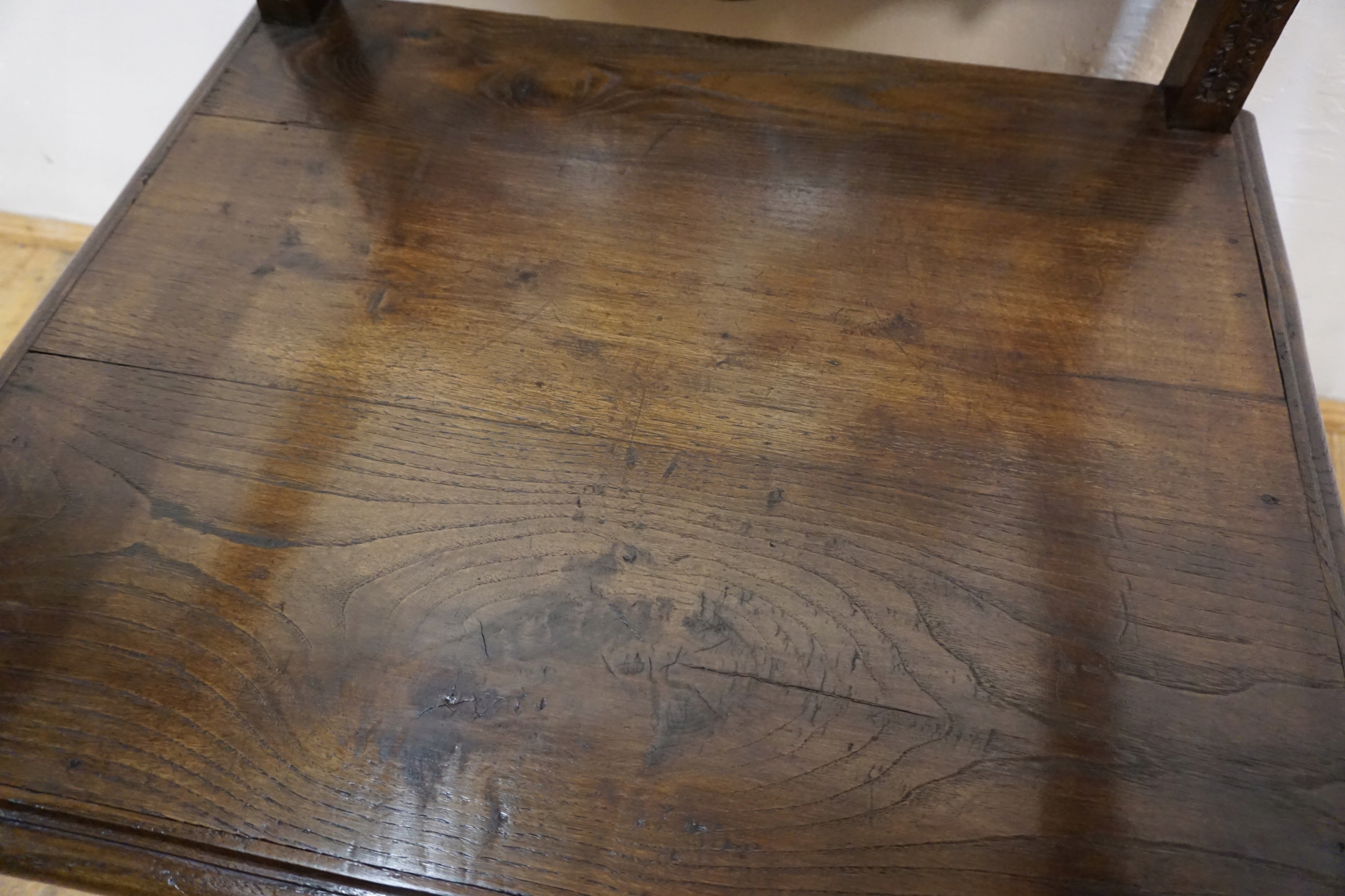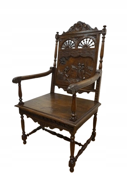Спинка кресла украшена жанровой сценой с изображением сельских жителей в бретонских костюмах, типичный мотив для мебели этого региона. Над сценой ажурные орнаменты в виде вееров, а венчает всю конструкцию навершие с розеткой и растительными мотивами.