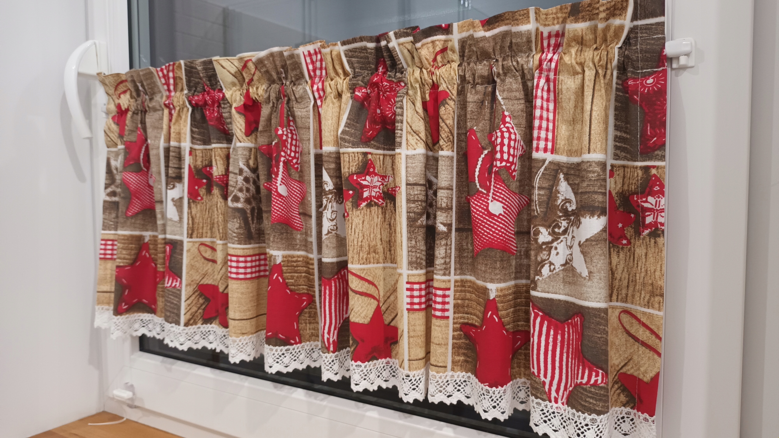 - Заздрос хлопковый, шириной 150 см, мерный в плоском виде (около 80 см после сборки) и высотой 50 см (кроме того, что от палочки вниз 46 см, а декоративный воротник над палочкой - 4 см)