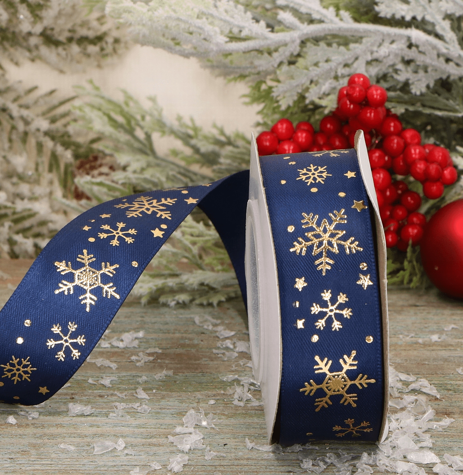 РОЖДЕСТВЕНСКАЯ ЛЕНТА - ТЕМНО-СИНЯЯ ЗОЛОТАЯ СНЕЖНО-БЕЛАЯ АТЛАСНАЯ ЛЕНТА 25мм 9м