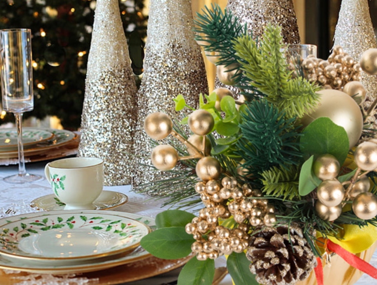 ✨ Традиционные новогодние цвета - золото, зеленый и натуральные акценты🌲 Богатое оформление - блестящие элементы, шишки, украшения 🪵