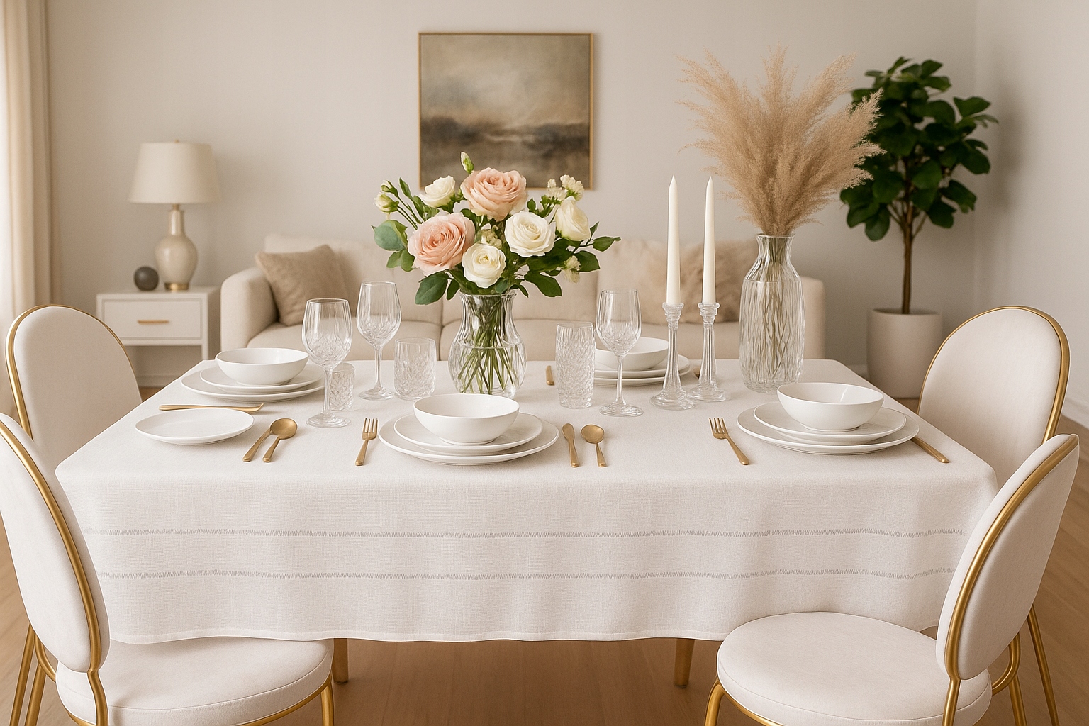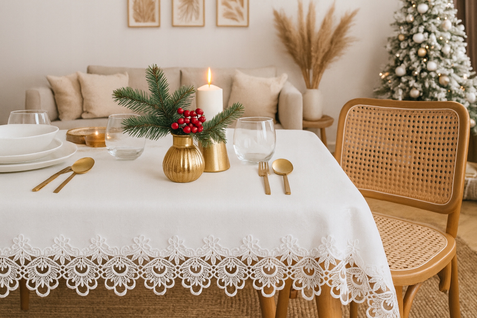Белоснежная скатерть добавит элегантности и очарования вашему интерьеру, и в то же время подчеркнет волшебный характер праздника.