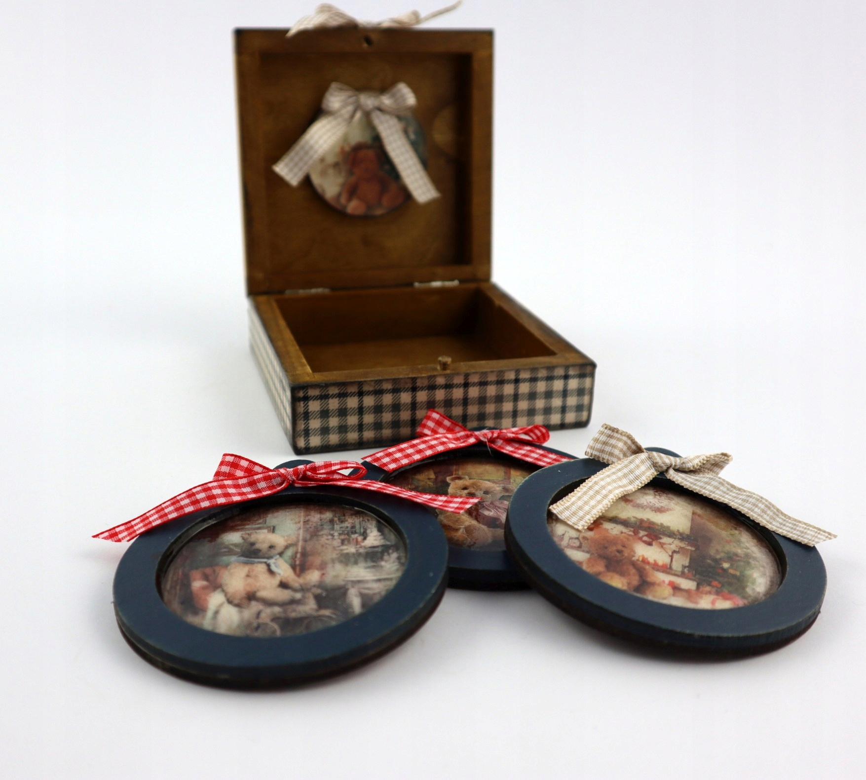 Наша коробка излучает рождественское очарование благодаря бело-синей неравномерной решетке по бокам, которая навевает воспоминания о зимних днях, проведенных в тепле дома. На крышке этой коробки изображен портрет плюшевого мишки, который становится квинтэссенцией рождественской атмосферы. Это словно момент, пойманный во времени, который напоминает нам о радости, любви и совместном времяпрепровождении во время Рождества.