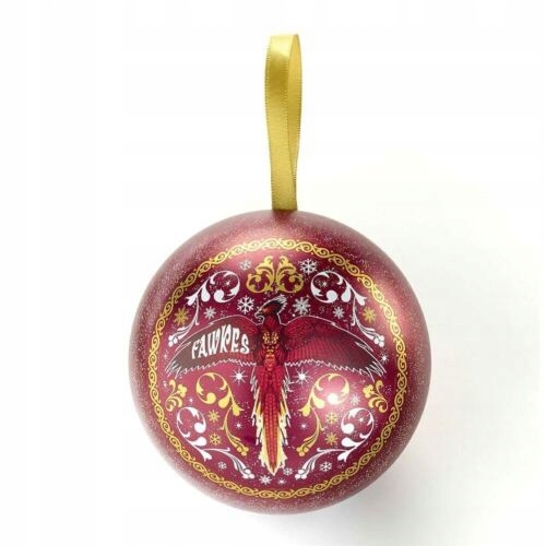 Эта красная металлическая безделушка украшена красивым принтом, на котором изображен декоративный рисунок феникса и оригинальный логотип Гарри Поттера на другой стороне. Внутри шара колье с изображением феникса, кулон отсылает к миру Гарри Поттера и станет отличным подарком. Помимо функции елочного украшения, безделушка также может использоваться как декоративная шкатулка для украшений или других мелких аксессуаров.