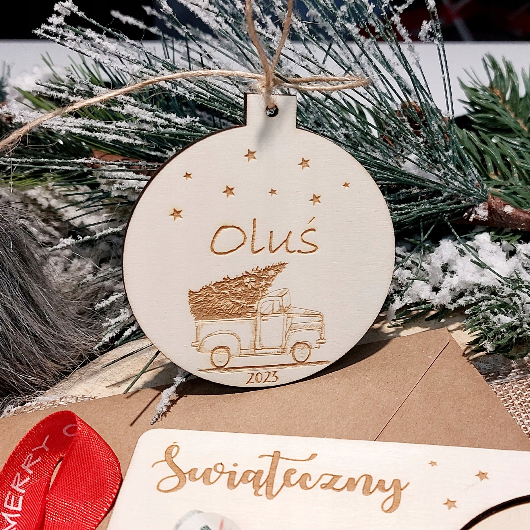 -Содержит безделушку, готовую повесить на елке (на рисунке изображена машина с елкой + ВАШЕ ИМЯ)
