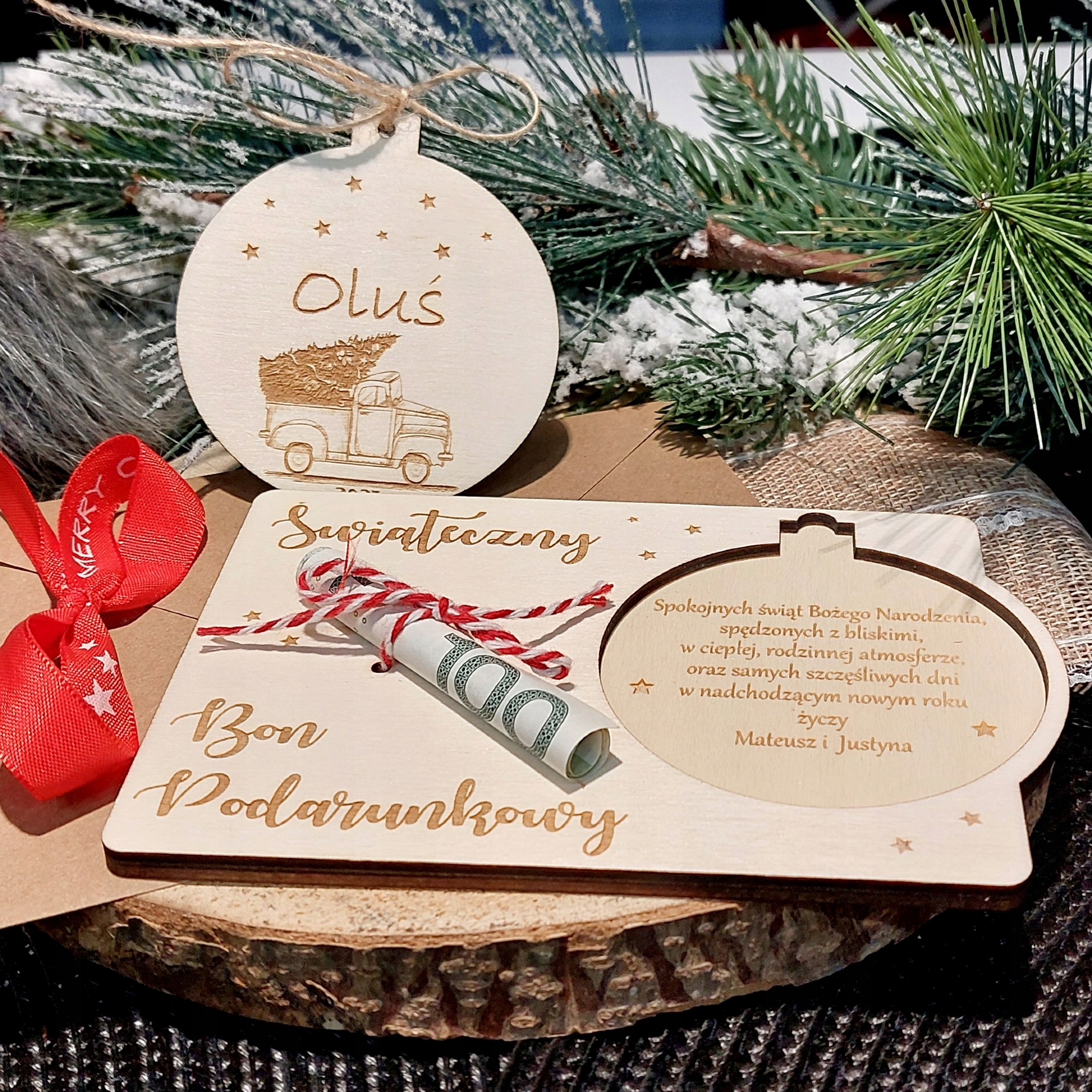 Наш рождественский подарочный сертификат с местом для купюры — отличная идея, чтобы красиво и оригинально подарить деньги близкому человеку. Кроме того, на ней выгравированы пожелания и безделушка с именем, которая скрывается в открытке! После раскрытия игрушки появляются желания и ее можно повесить на елку!