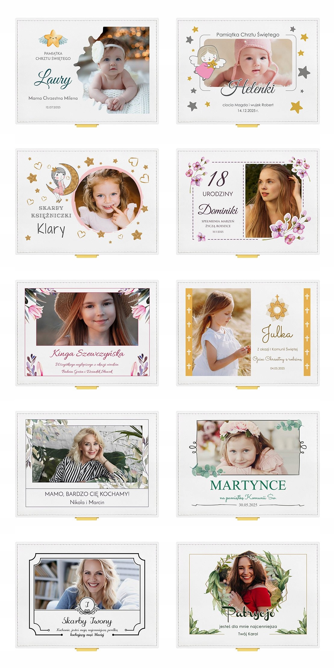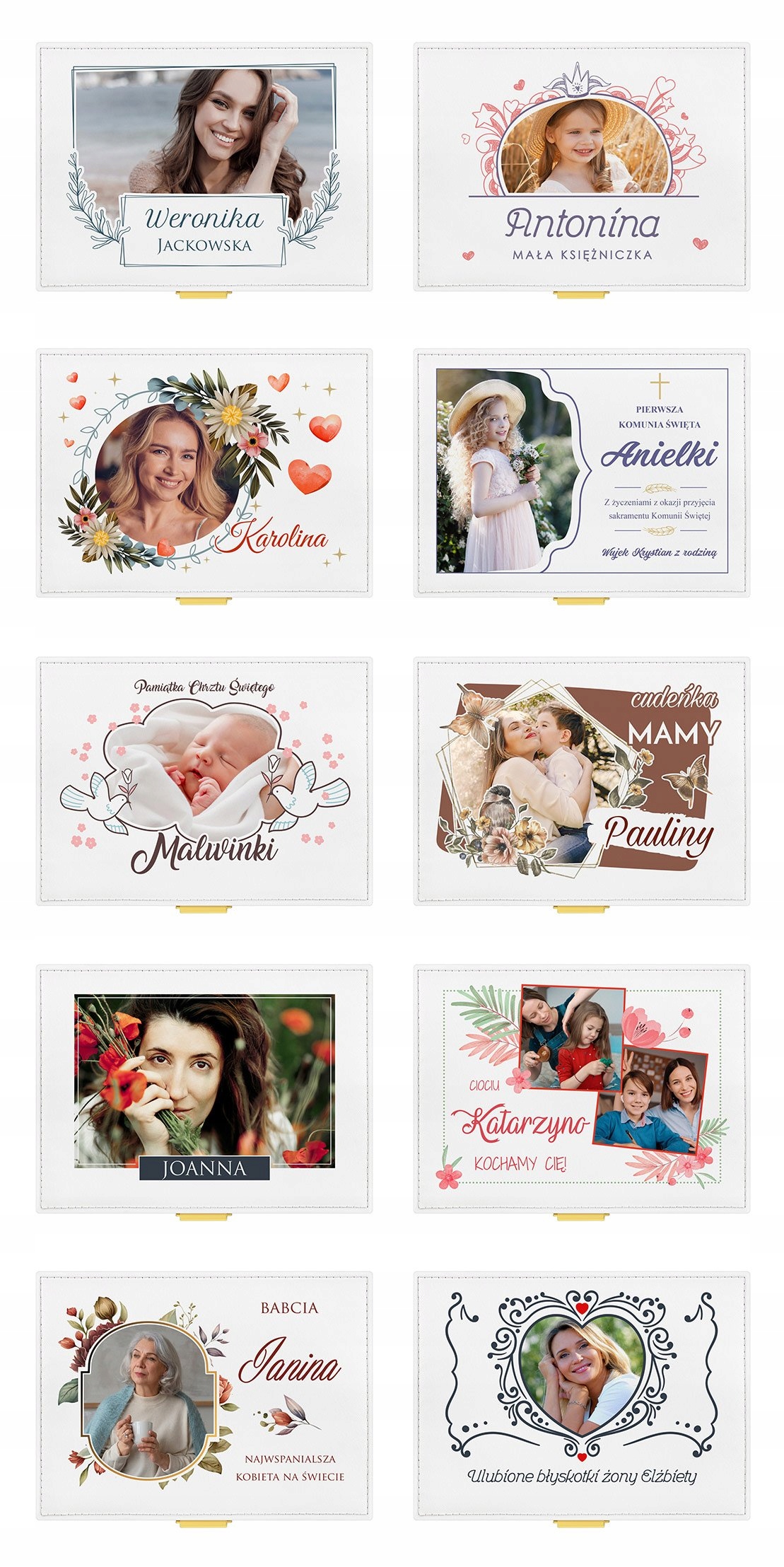 Белая коробка с принтом – прекрасный подарок. Эта персонализированная коробка отличается классической формой и точными деталями. Приятные для глаз пастельные тона футляра и тонкая строчка подчеркивают эксклюзивный характер изделия. Внутренняя часть покрыта приятным на ощупь бархатным материалом. В верхней части находится зеркало и место для ожерелий, браслетов и сережек. Коллекция золотых и серебряных украшений будет храниться в 2 ящиках. Мы добавляем подарочную упаковку совершеннобесплатно! Выберите дизайн и создайте персонализированный подарок подходящий к замечательному случаю.