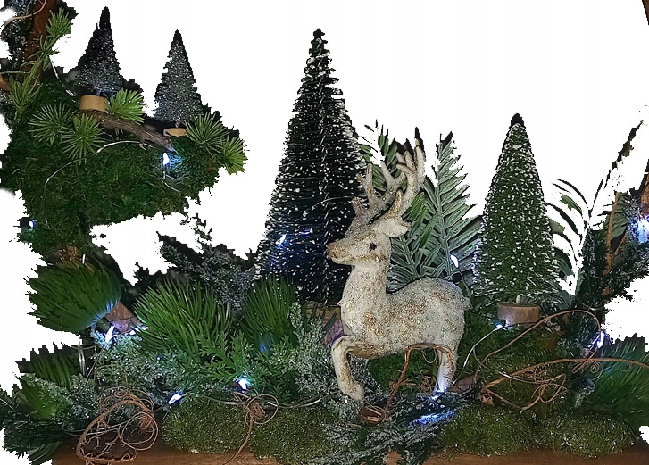 См. Презентацию красивой рождественской рождественской композиции, сделанной в руках. В современных цветах зелени с добавлением натуральной древесины, все освещенные светодиодными лампами, что познакомит нас с сказочной атмосферой Рождества. Натуральные материалы и идеально подходящие цвета создают уникальный головной убор, который идеально сочетается в комнатах, создаст уникальное настроение и принесет небольшую атмосферу зачарованного Рождества. Головной убор станет отличным украшением рождественского стола, комодом, подоконником или камином.