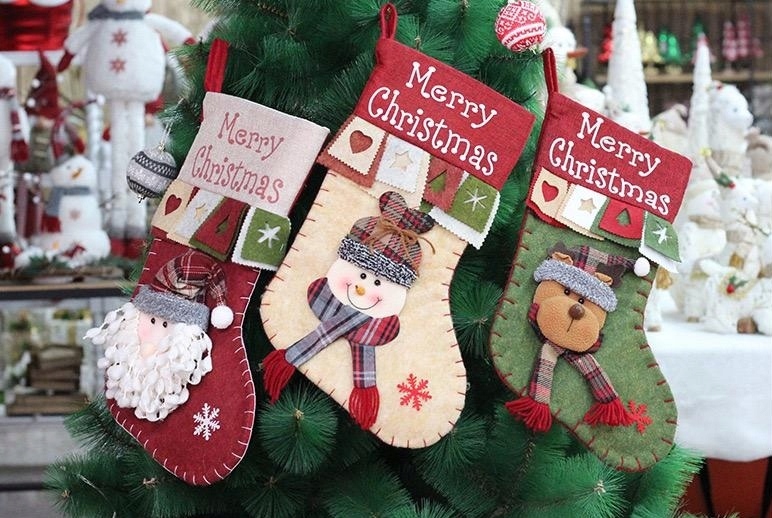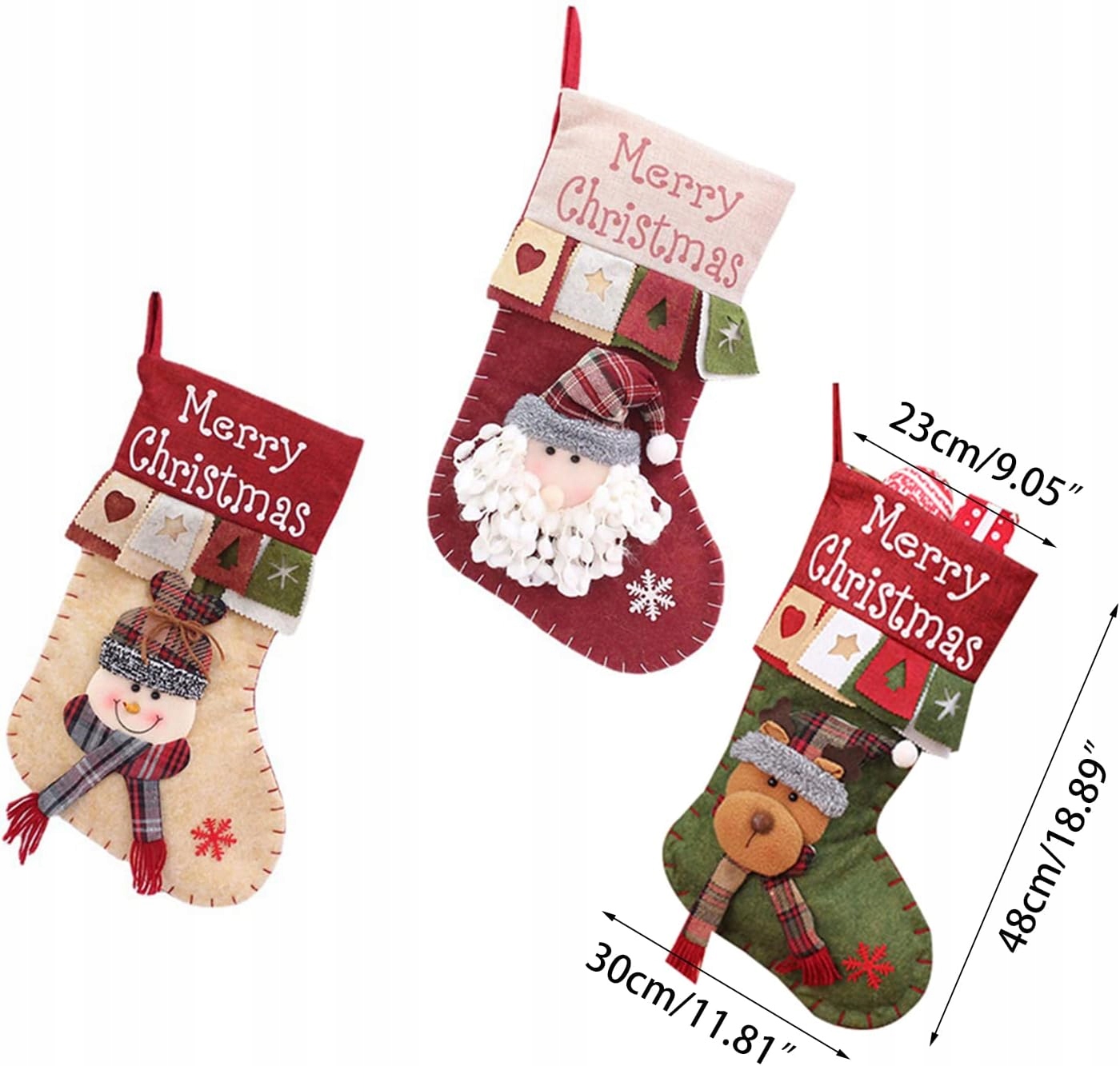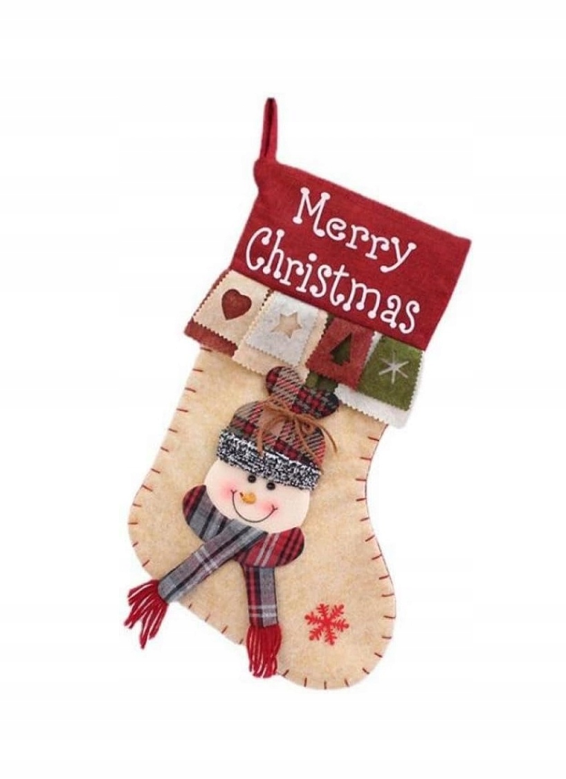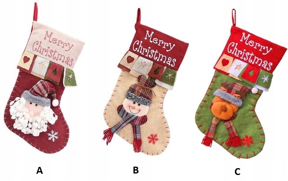 Декоративные рождественские чулки для камина, лестниц, окон и дверей. Они изготовлены из фетрового материала очень хорошего качества. Спереди у них есть аппликации с изображениемДеда Мороза, Снеговика или Оленя. Носок также можно использовать как обувь в подарок.