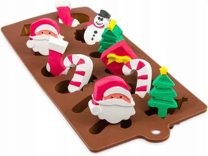 Силиконовая форма с новогодними узорамидля изготовления домашних шоколадных конфет и конфет с выемками в виде: леденцов, снеговиков, подарков, елочек, носков и головы Санты. Изделие представляет собой предназначенный для этого, также используется для создания желе или кубиков льда.