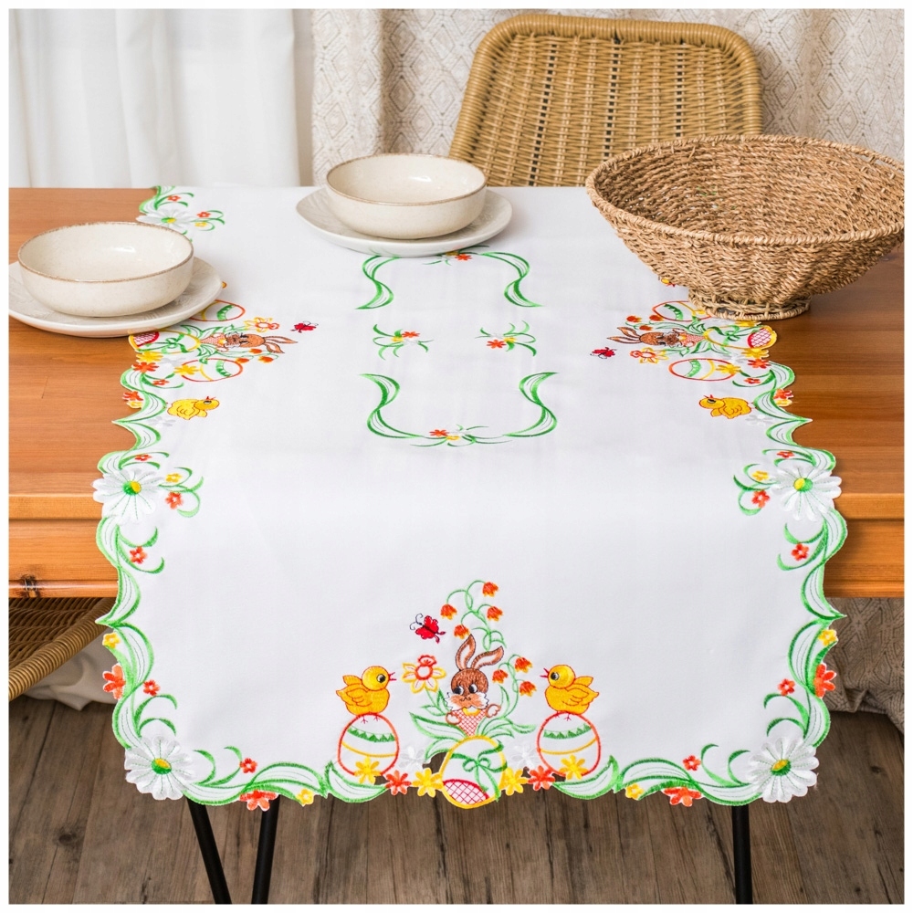 Рождественская скатерть Пасхальная вышитая на столе 130x180 Белые пасхальные яйца белых кроликов
