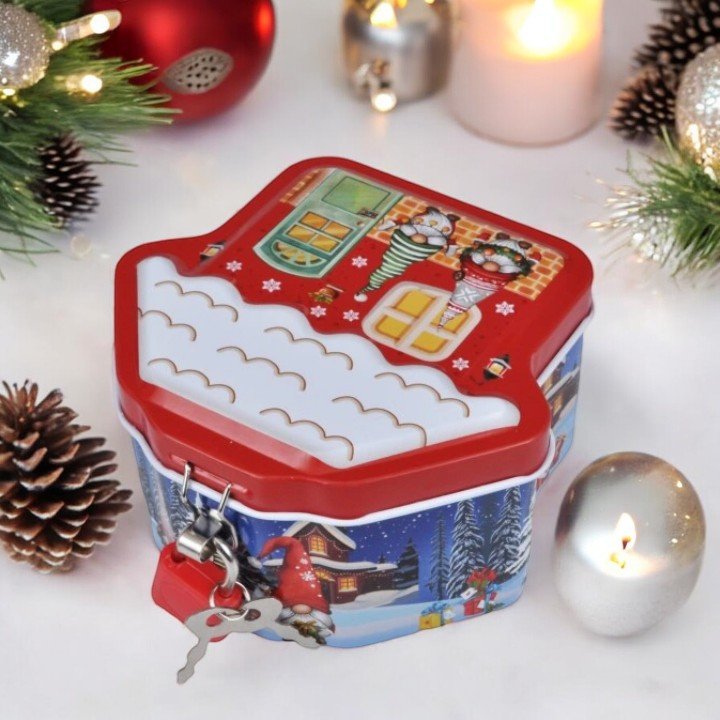Предлагаем уникальный праздничный контейнер в форме домика с навесным замком 🎄🏠! Этот очаровательный контейнер размерами 9,5x10x5 см станет прекрасным дополнением к вашим новогодним украшениям 🎁. Изготовленный из прочных материалов, он идеально подойдет в качестве хранилища для небольших подарков, сладостей 🍬 или других мелких вещей, которые хочется скрыть от глаз домочадцев.
