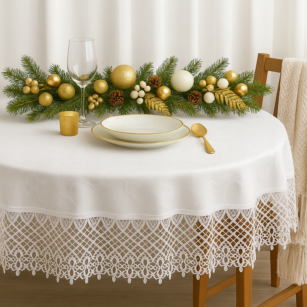 В это Рождество выберите вневременную элегантность и теплоту домашней атмосферы. Эта уникальная рождественская скатерть украшена нежной ЗОЛОТОЙ отделкой, которая тонко переливается в свете свечей и елочных гирлянд. Благодаря этому каждое блюдо приобретает неповторимый, праздничный характер.