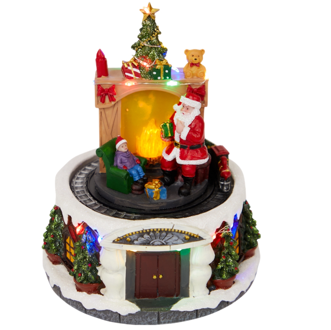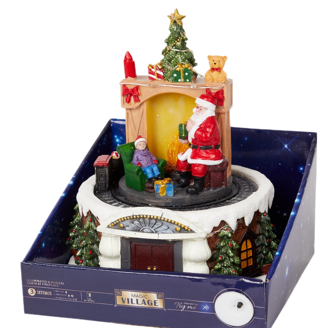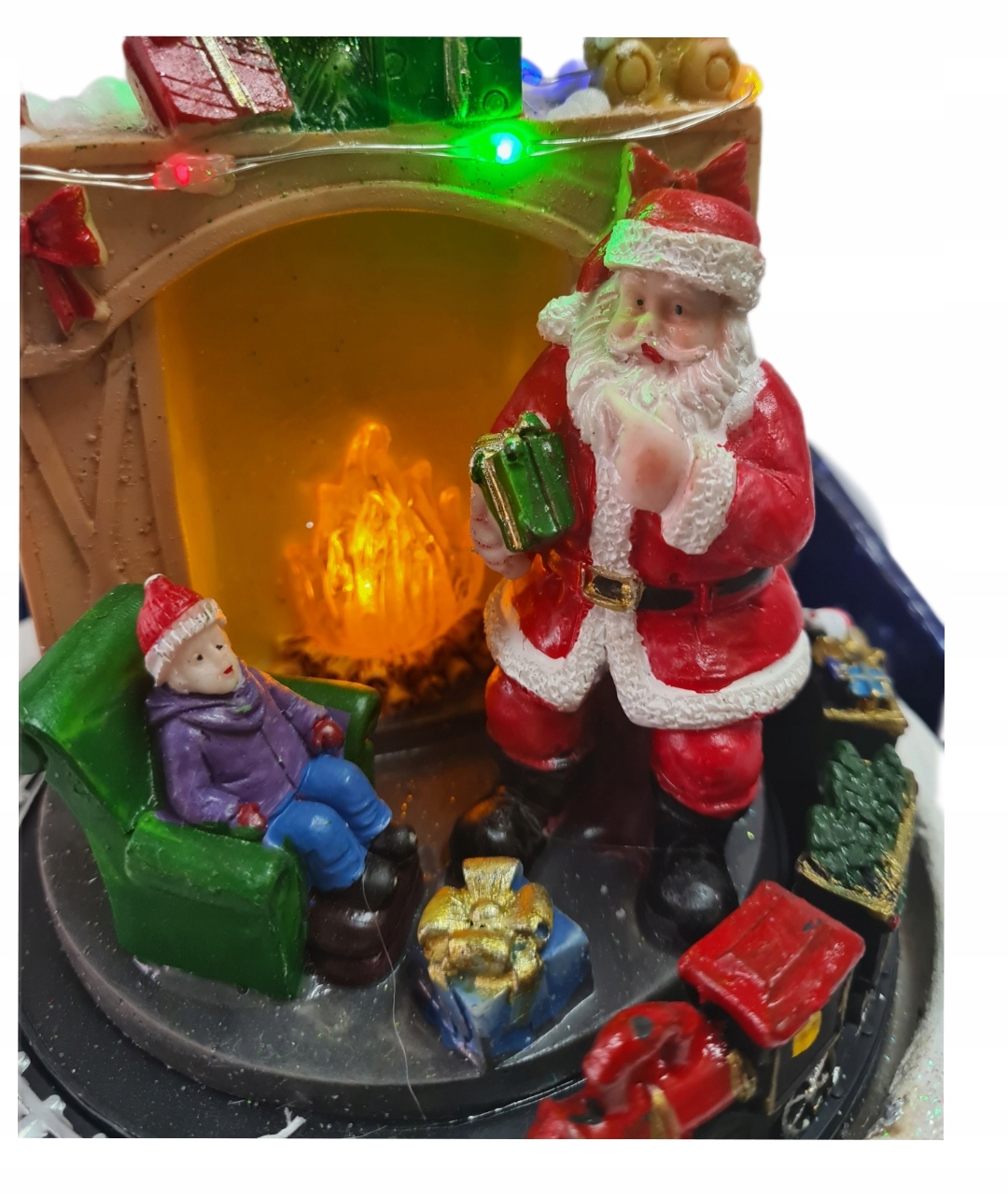Рождественская сцена с Санта-Клаусом у камина, блестками, светодиодным освещением и музыкой.