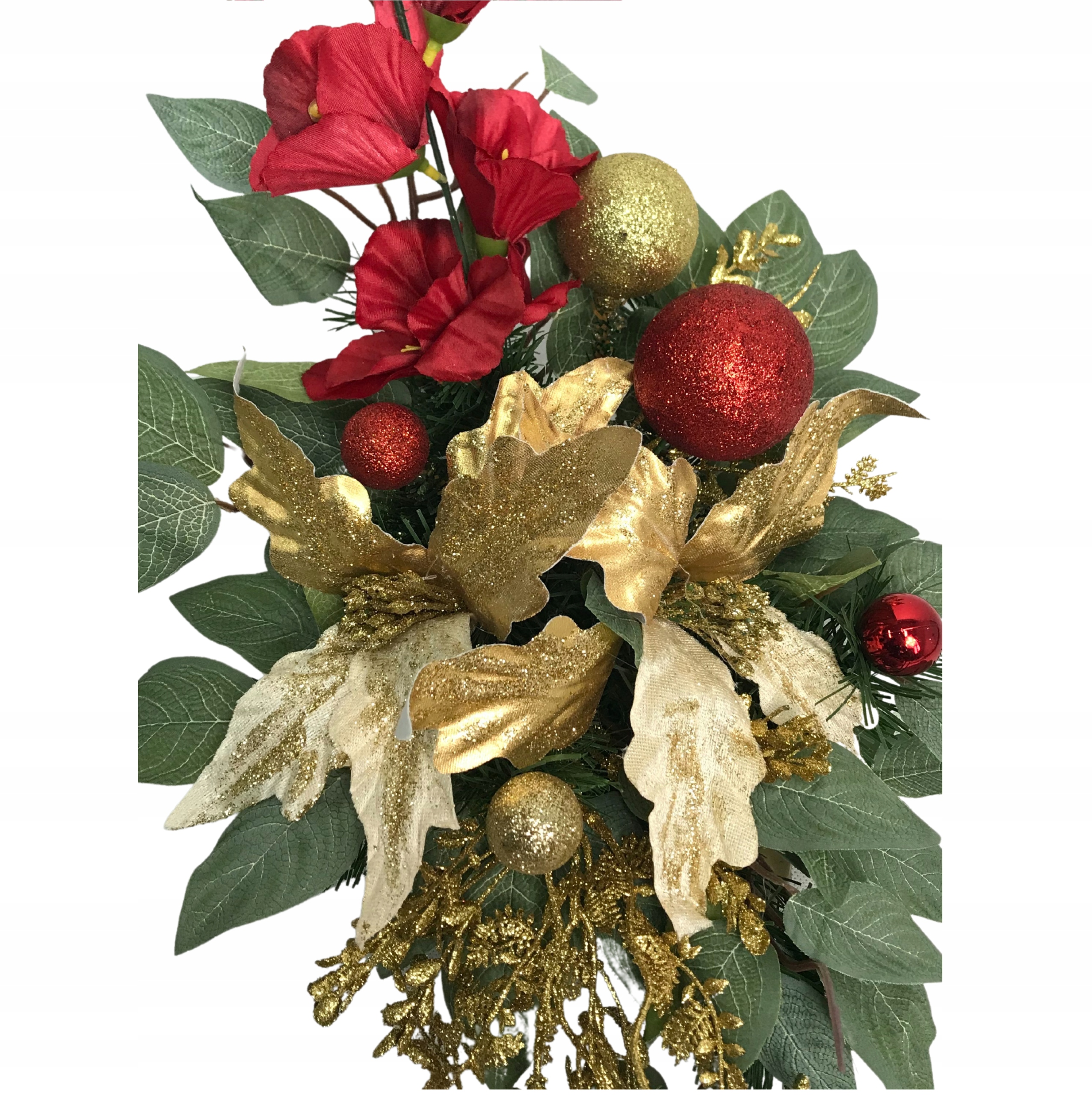 Цветочная композиция изготовлена из искусственных цветов высочайшего качества. и добавки. Для создания украшений были использованы красивые вифлеемские звезды, фенечки разных размеров, большое количество зеленых листьев и рождественские блестящие украшения, прекрасно заполняющие пустующие пространства.