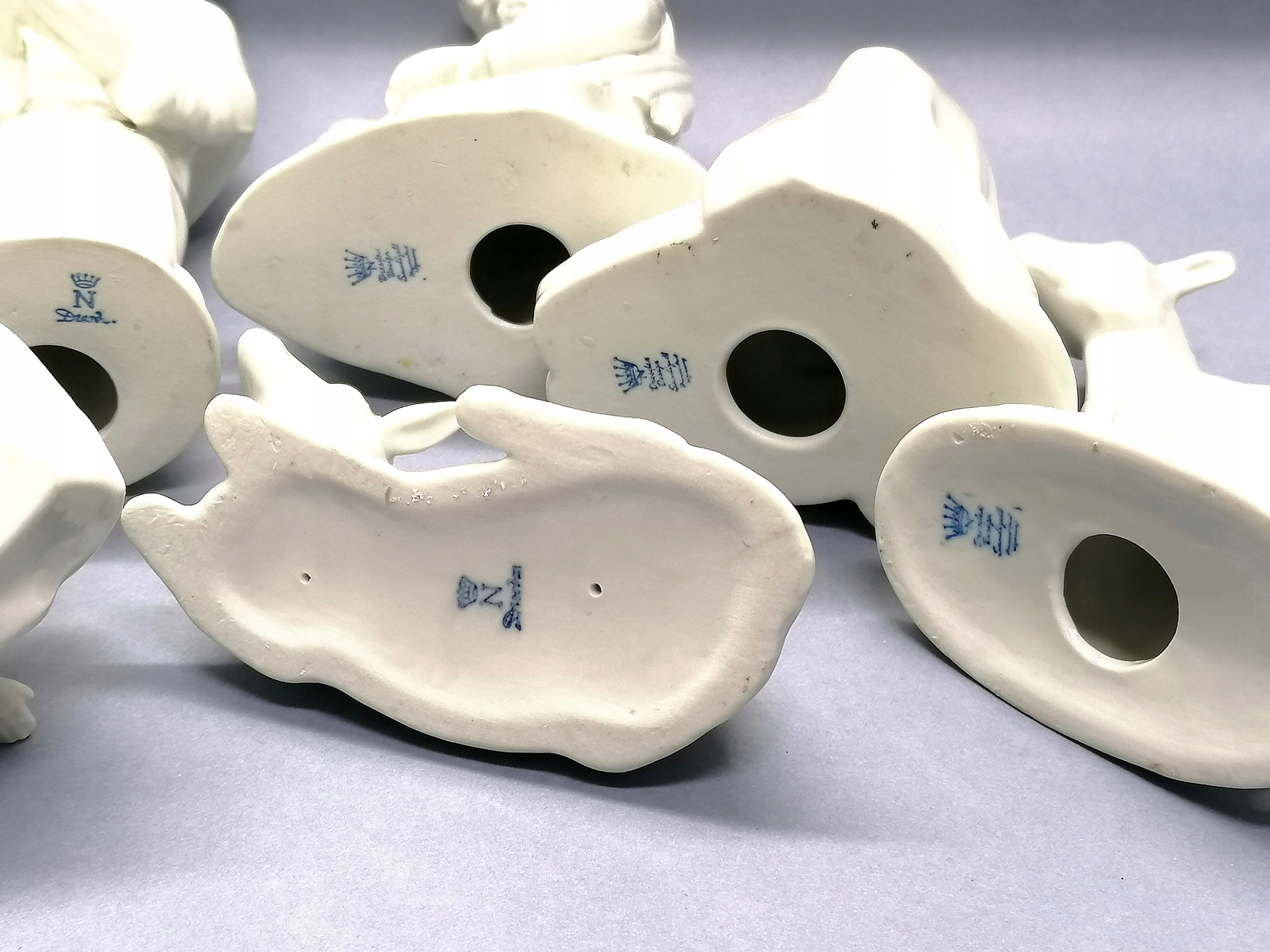 Белый, красиво глазурованный фарфор изображает персонажей и животныхв реалистичной ( не "чрезмерно") формы.