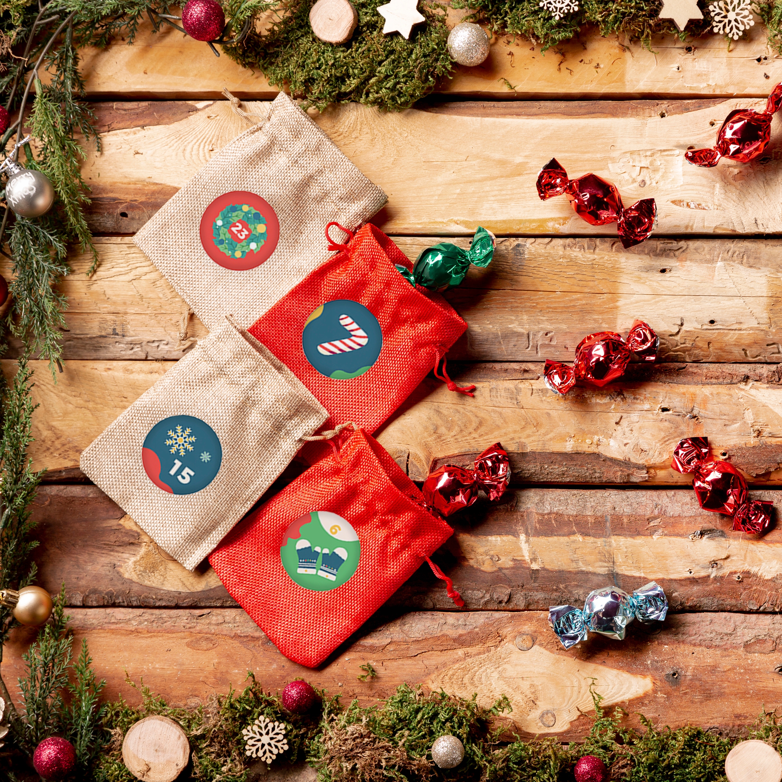 В комплект не входят пакетики, зажимы и т.п., только лист наклеек. На фотографиях представлено предложение по созданию Адвент-календаря. Для завершения набора вы также можете приобрести деревянную основу для календаря с именем ребенка.