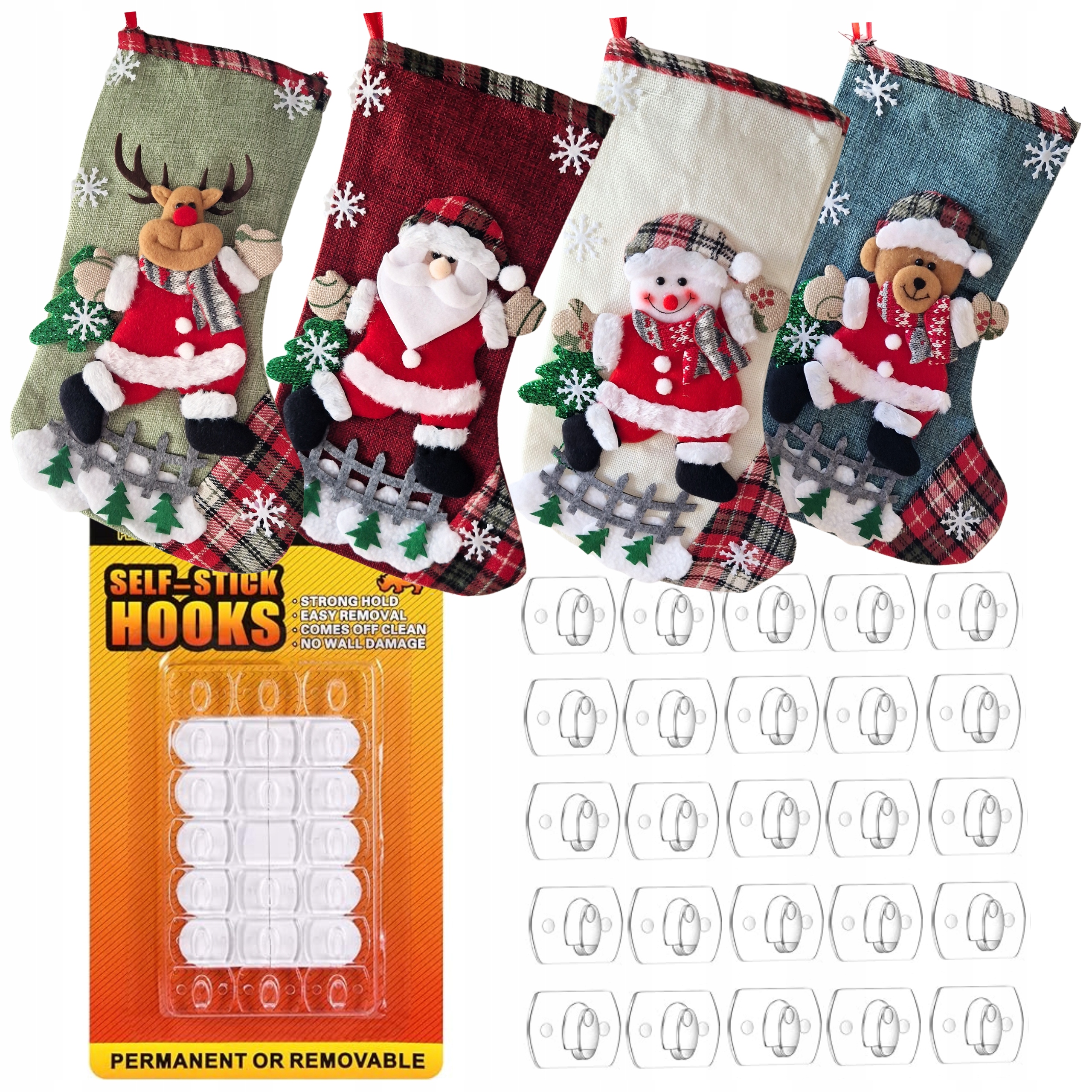 В комплект входят практичные самоклеящиеся крючки, позволяющие быстро и надежно повесить носки в выбранном месте. Это готовый декоративный набор, не требующий дополнительных аксессуаров.