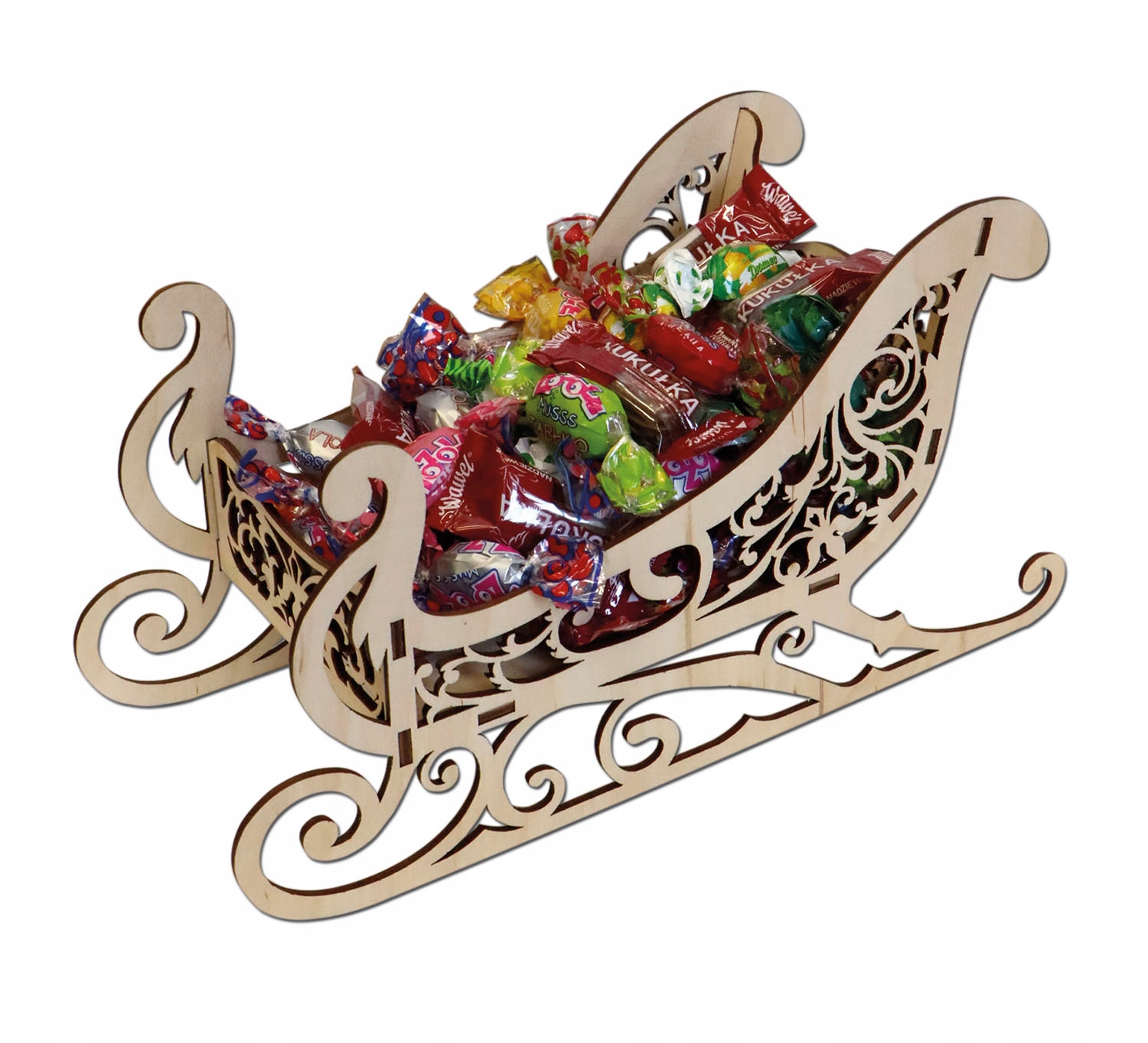 - Подставка для бутылок, сладостей, подарков - сани, вырезана лазером из березовой фанеры 3 мм.