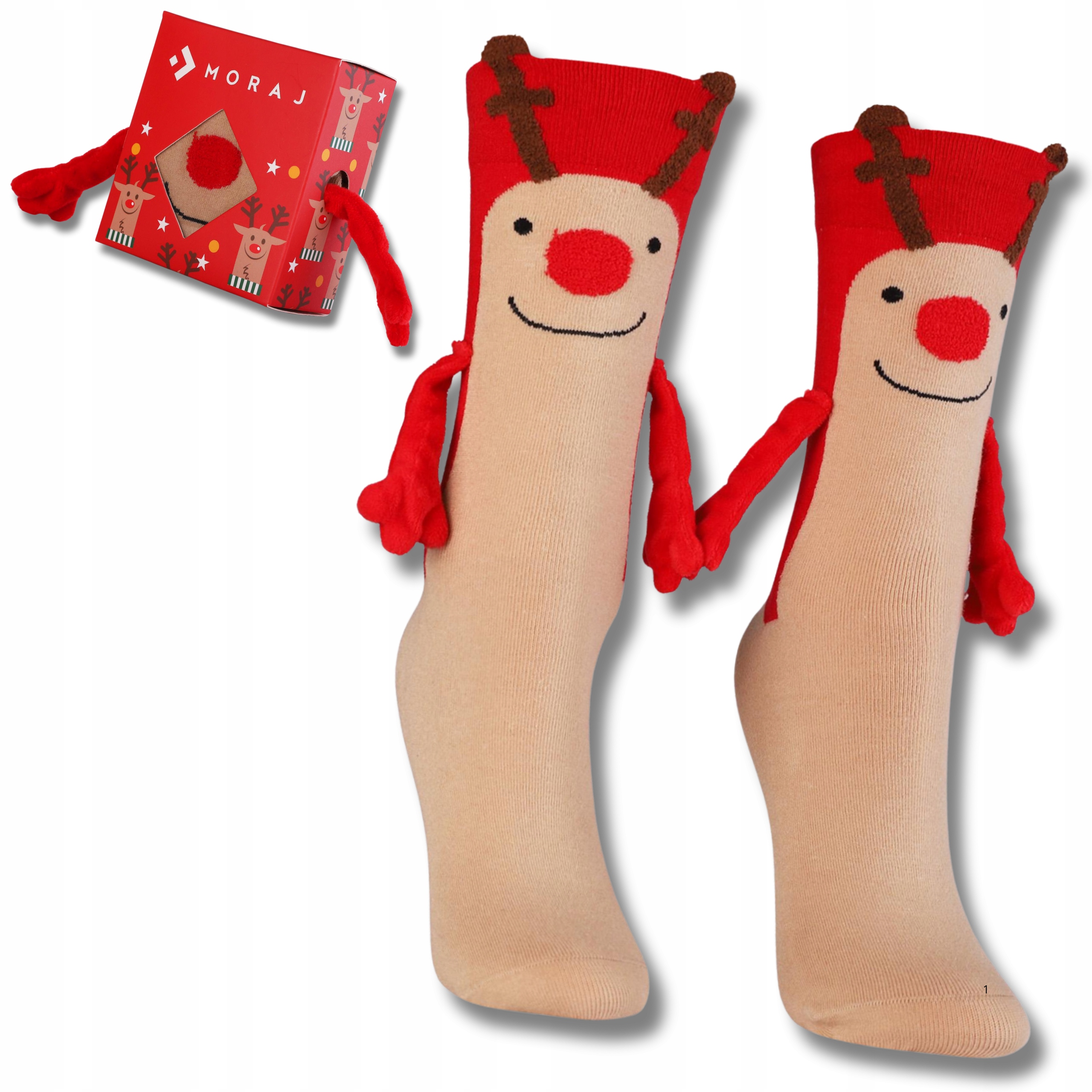 Их неповторимым акцентом являются магнитные ручки, которые позволяют носкам «обниматься», придавая им шарм и неповторимый характер. Очаровательный узор в виде оленя с красным носом идеально впишется в рождественскую атмосферу и станет прекрасным дополнением семейных посиделок или зимнего образа.