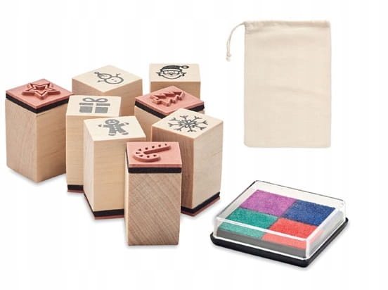 Набор из 8 деревянных рождественских марок и чернил, упакованных в хлопковый мешочек на шнурке.