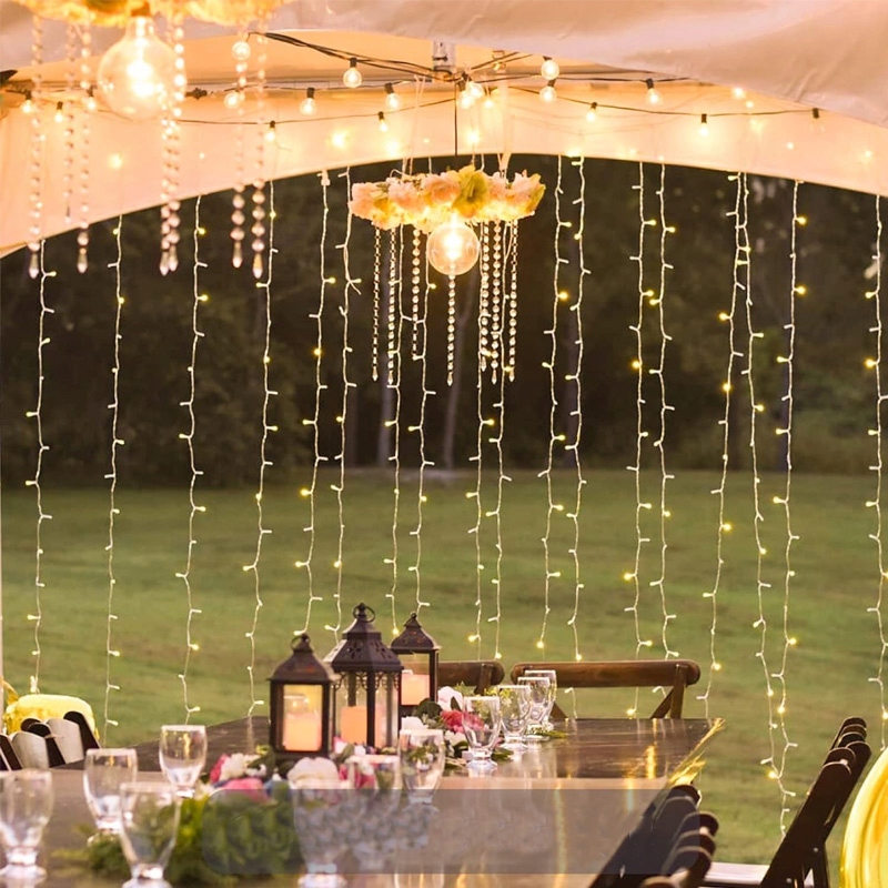 Световая светодиодная завеса: 3 х 3 м с 300 светодиодами теплого белого цвета. Управляется с помощью пульта. Контроллер имеет функцию памяти, благодаря которой предыдущие настройки запоминаются и вызываются после перезапуска.